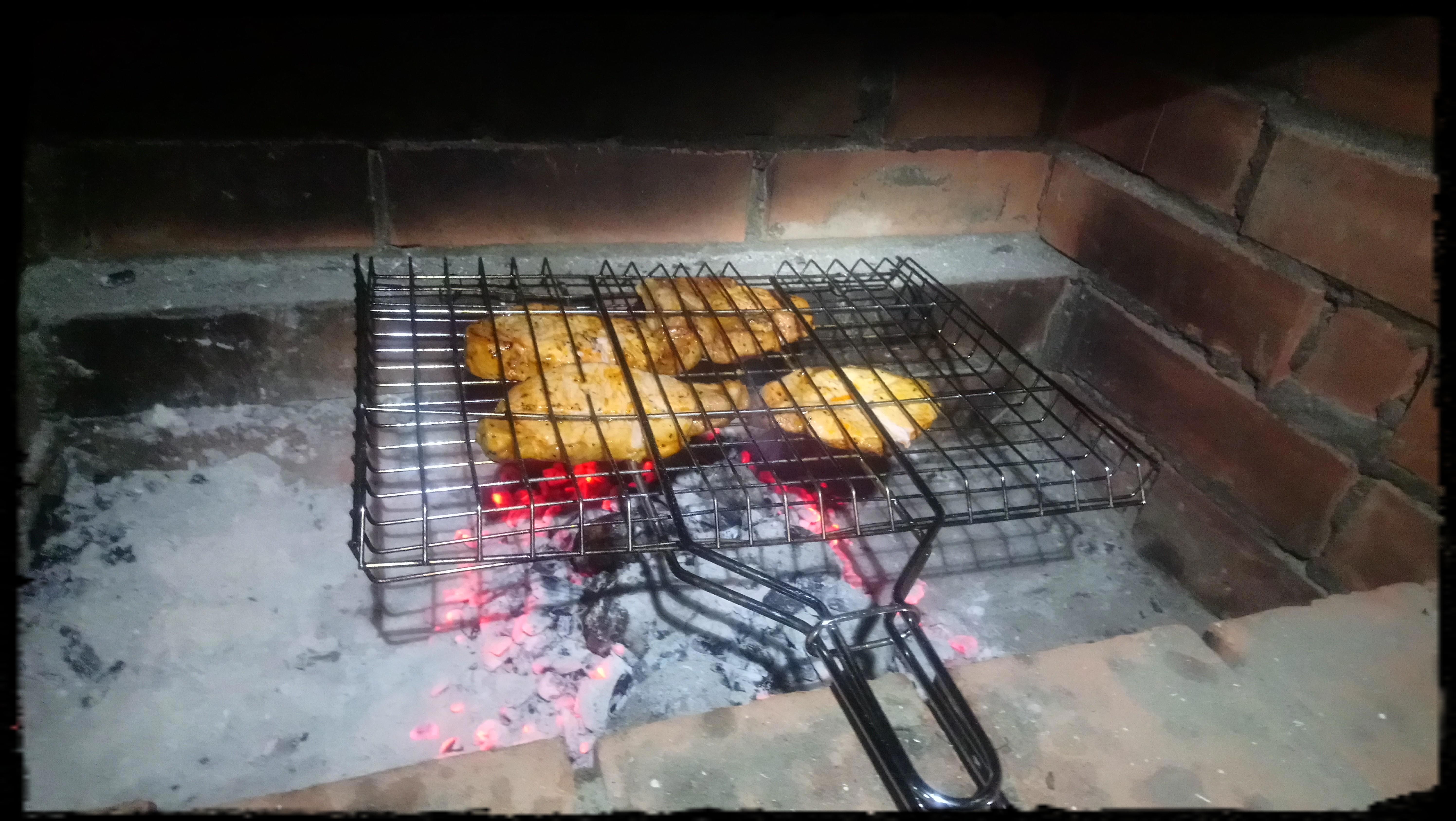 Стейк 🥩 из свиного окорока в маринаде "Алабама", под решёткой в углях закопана картошка (вегетарианцы могут обернуться).