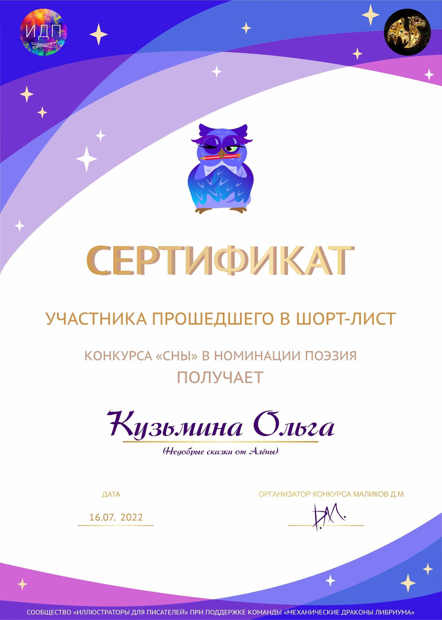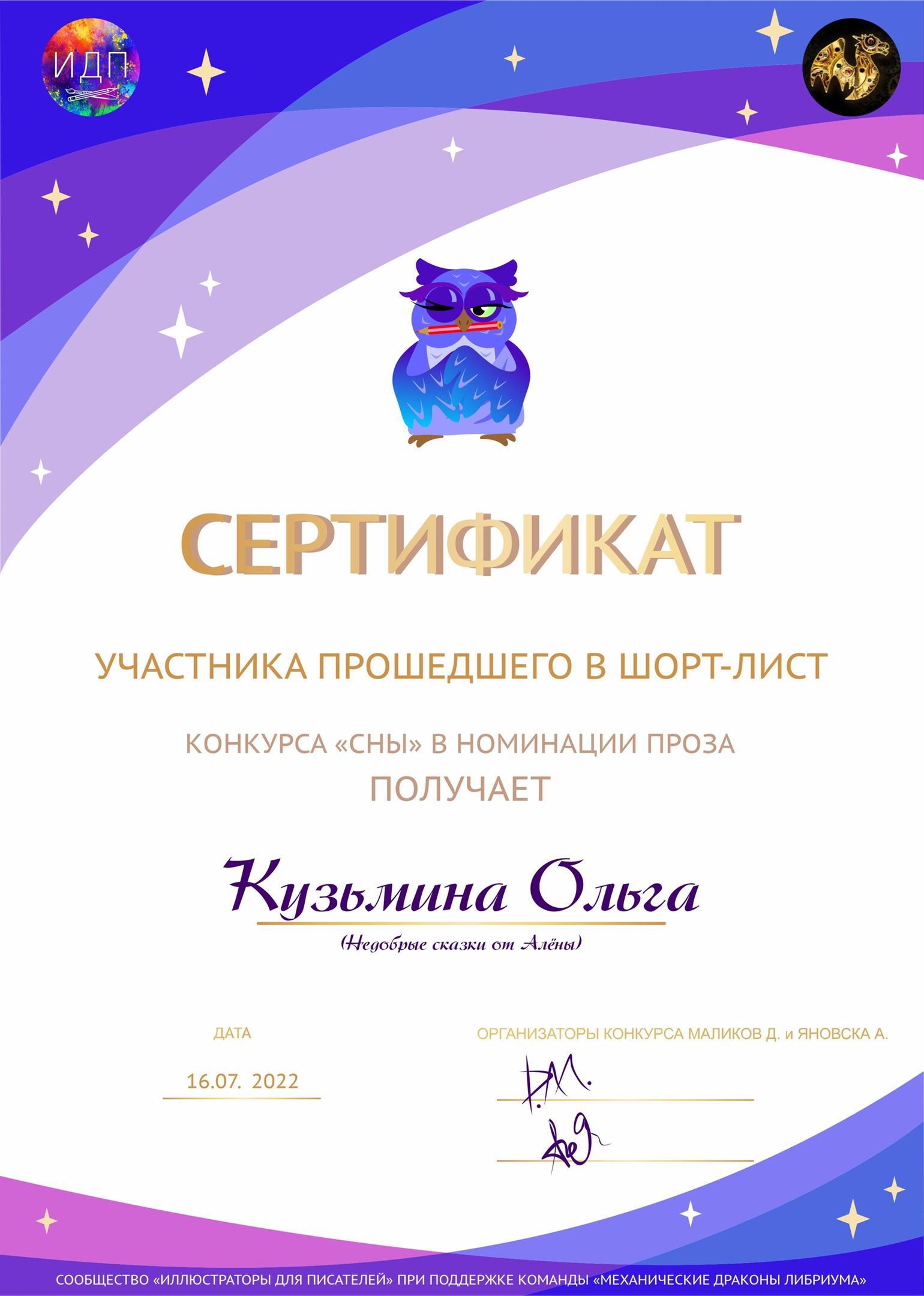 Автор: Кузьмина ОльгаПоучаствовала в конкурсе "Сны" с отрывком из "Коллекционеров редкостей" (сон Редди) и стихотворением "Ты". Результат безмерно обрадовал :)