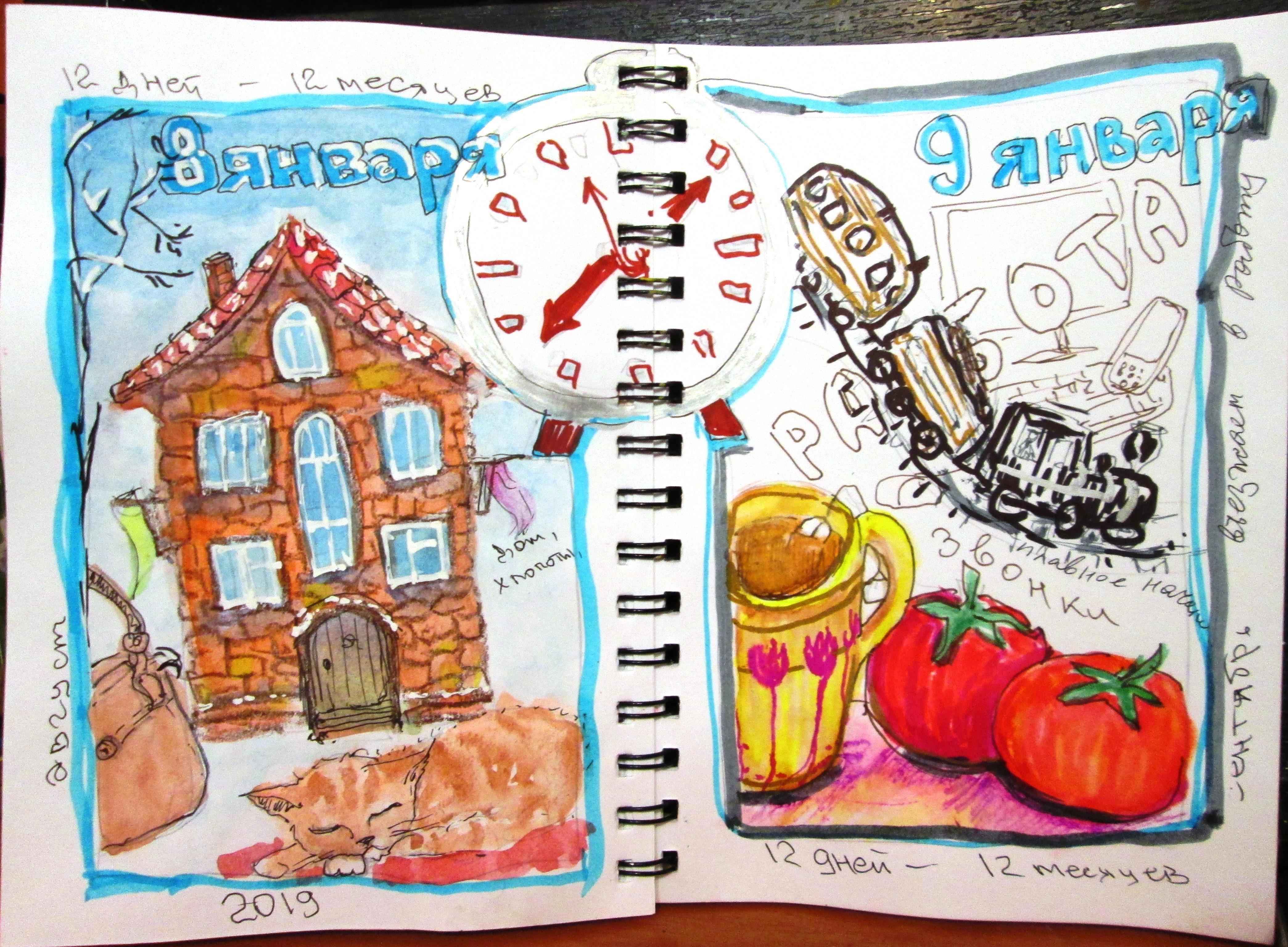 10 января я как-то устала и рисовать была не в силах. И ярких визуальных впечатлений тоже не было. Поэтому этот день я решила изобразить при помощи простого коллажа. Нарисованная старушка вырезана из моего блокнотика с набросками.
