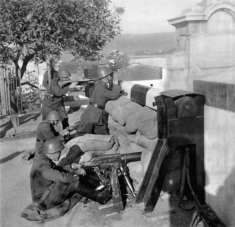 Бойцы чехословацкого пограничного отряда «Отряды Защиты Государства» (Stráž obrany státu, SOS) из батальона №24 (Новые Замки, Нитра) на мосту Марии Валерии через Дунай в Паркано (нынешнее Штурово) в южной Словакии готовятся к отражению венгерской агрессии. (пулеметчики со станковым Шварцлозе и ручным ЧеЗет29)