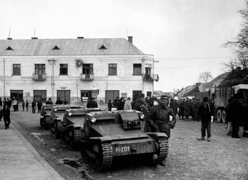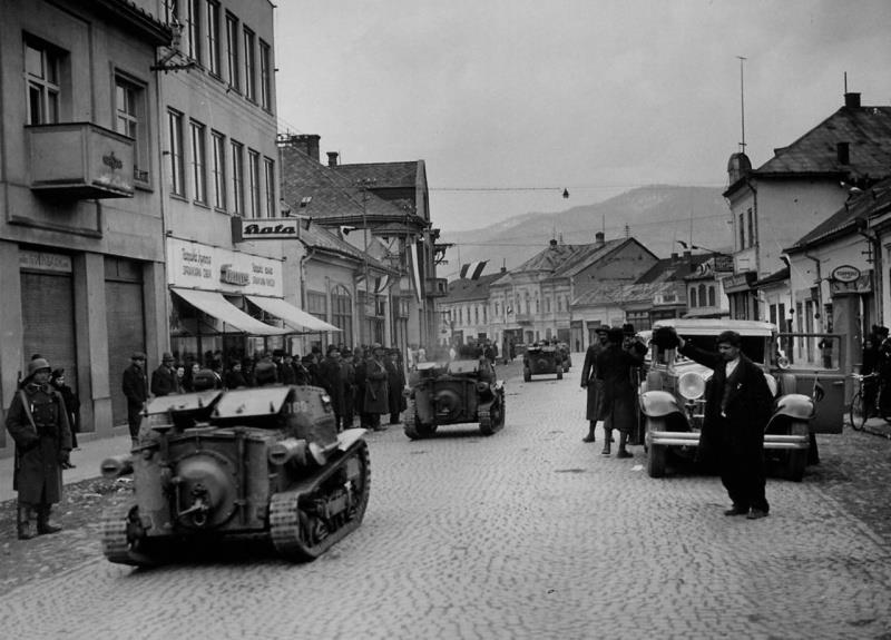Танкетки венгерских оккупационных войск итальянского производства «Фиат-Ансальдо» CV-35 входят на улицы чехословацкого города Хуст.