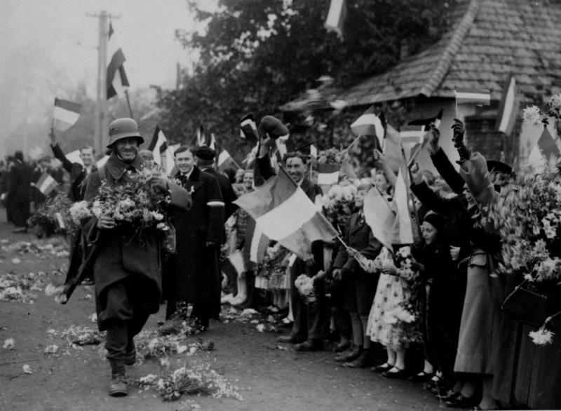 Мирные жители встречают цветами венгерских солдат в оккупированном cловацком населенном пункте в южной Словакии (словацкое название — Horná zem, венгерское — Felvidék) со значительным процентом венгерского населения.