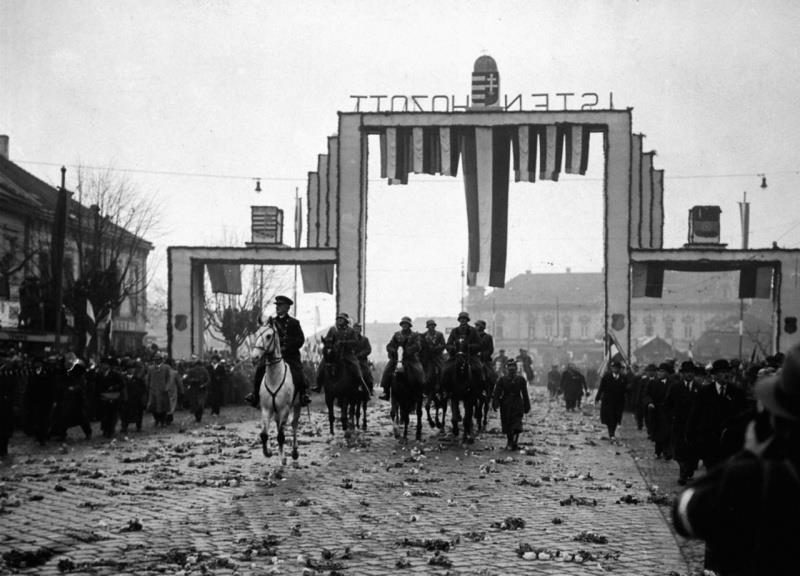 Правитель (регент) Венгерского королевства адмирал Миклош Хорти (на белом коне) во главе парада венгерских войск в оккупированном чехословацком городе Кошице (по-венгерски Kassa) после его оккупации 2 ноября 1938 года.
