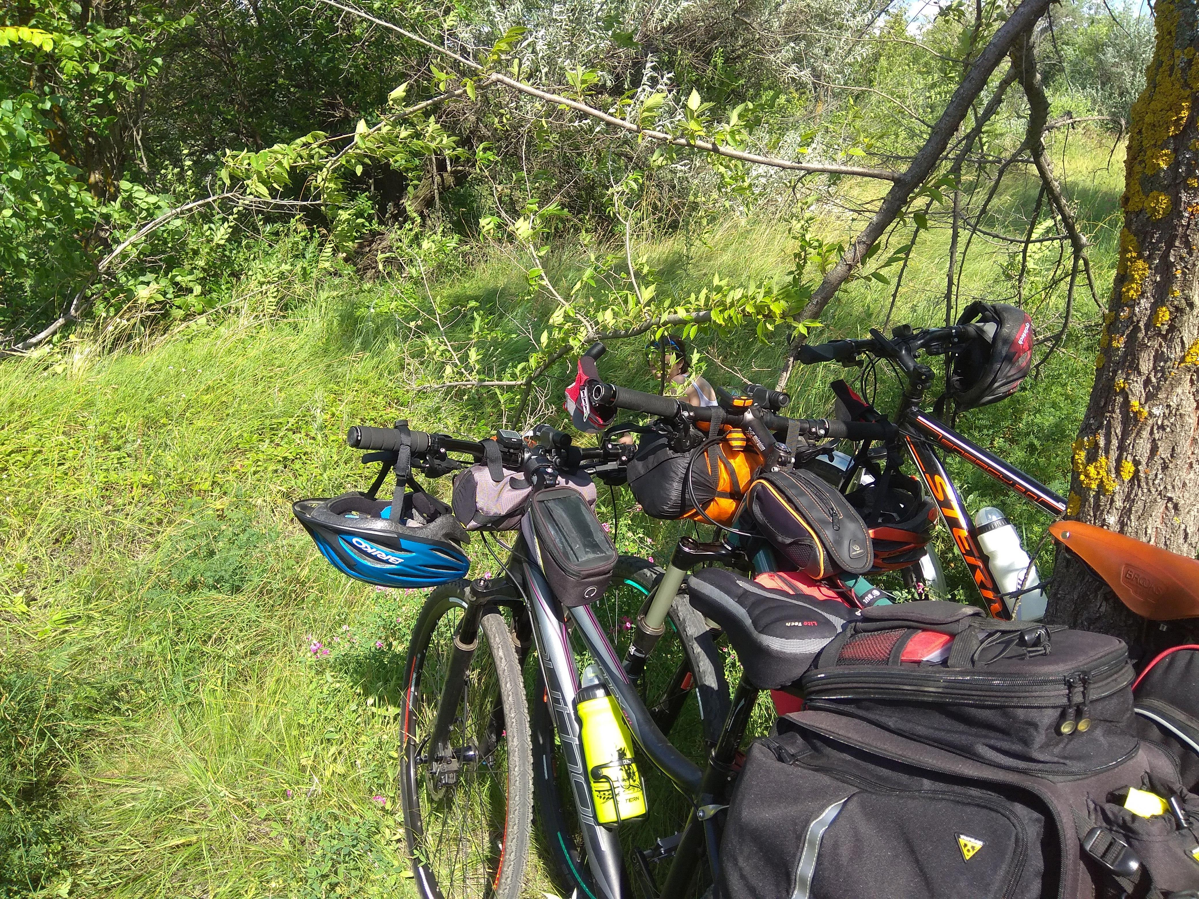 В общем - на багажнике висит здоровая сумка-штаны, гружённая под самую маковку и превыше того. Плюс спереди, на руле, тоже гружённая сумка. С собой палатки, коврики, спальники, одежда на бивак, питание и - самое главное для степного выезда - ВОДА. Без неё в наших, летних самритских - пардон! Самарских, конечно же! степях - просто смерть. А в жаркую погоду да на интенсивное катание нужно до 9 литров в день на человека. Представили себе объёмы запасов на полудневный переход?