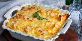 Рыбу отделить от костей, посолить, обвалять в муке и обжарить с обеих сторон. Яйца взбить с молоком, подсолить, залить ими рыбу и запечь в духовке. При подаче на стол полить растопленным сливочным маслом, посыпать зелёным луком. Отдельно можно подать молоко.