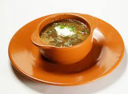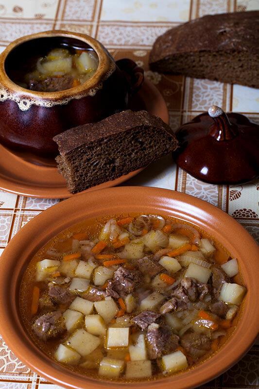 Приготовить костный бульон. Мякоть говядины нарезать небольшими брусочками. В чугунок или глиняные горшочки налить бульон, положить мясо и варить в духовке 20-30 мин при температуре 150-200°С. Картофель нарезать кубиками. Лук нашинковать кольцами, морковь – тонкими ломтиками, обжарить, положить вместе с картофелем в чугунок или горшочки с мясом и варить 15 мин. Затем добавить перец, лавровый лист, зелень и варить ещё 10-15 мин. В готовую похлёбку для вкуса можно влить немного сухого вина. Подавать похлёбку на стол в той посуде, в которой она готовилась.