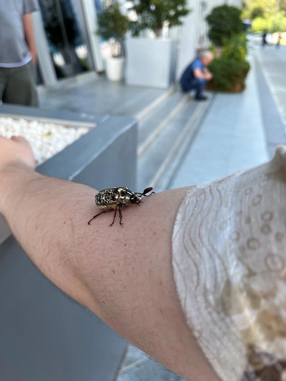 Мраморный хрущ взбирается по руке молодого человека. Крючками на лапках он вцеплялся в кожу и отодрать его было проблематично.