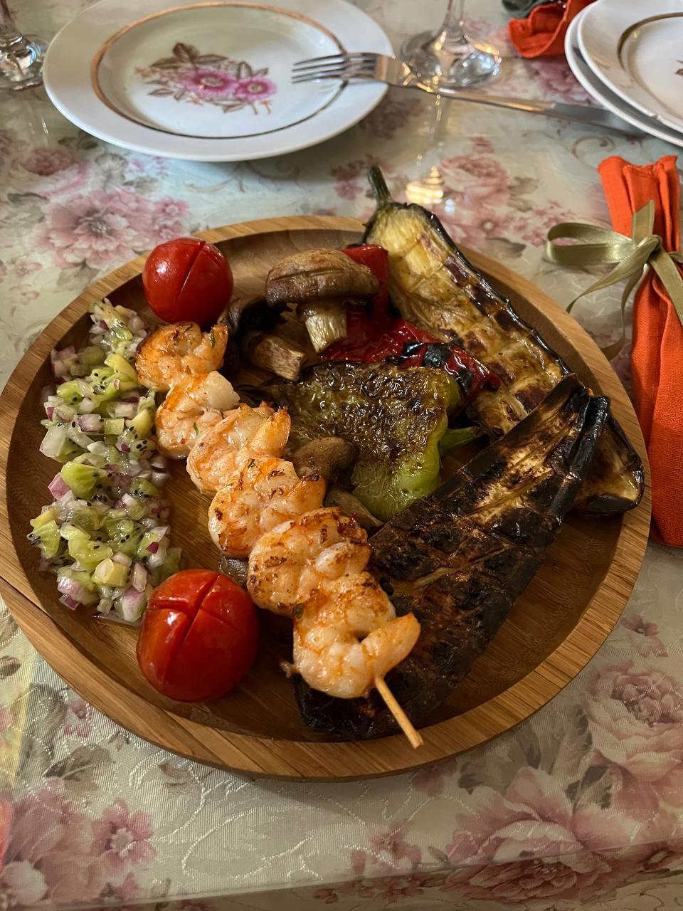 Креветки и овощи гриль в атмосферном ресторане "Хурма". Одно из самых необычных сочетаний в моей жизни: сладкий киви и молодой острый лук. Вкусно