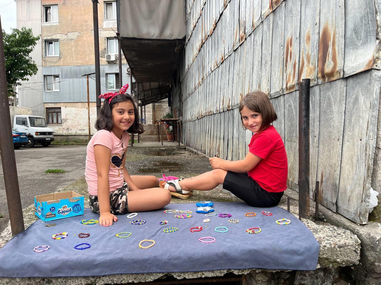 В самом обычном дворе две грузинские девочки играли. Я почти уверенна, что браслеты они не делали на продажу, потому что сидели НЕ в туристическом месте и НЕ понимали ни русского ни английского. Наверное, играли между собой в магазин или ювелирный салон.