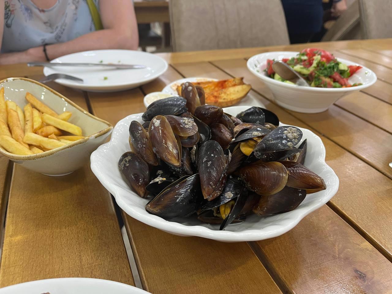 Мидии на рыбном рынке.
