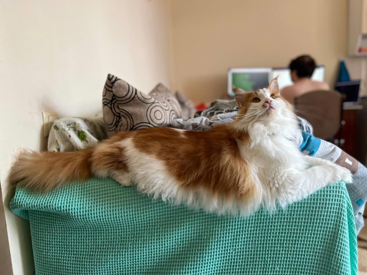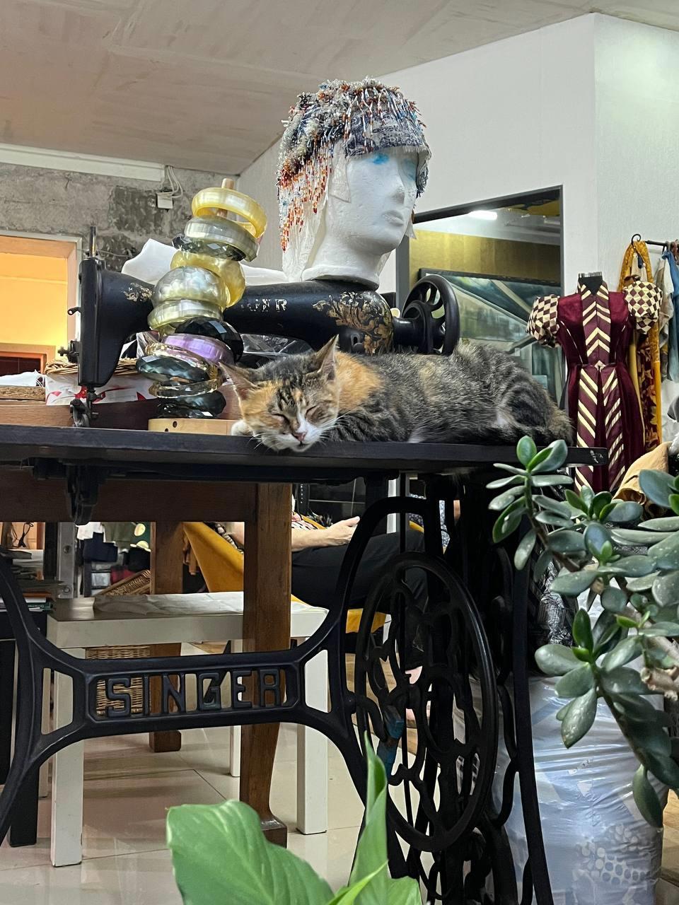 Трёхцветная кошечка живёт в атмосферном ателье, которое находится по дороге на пляж.