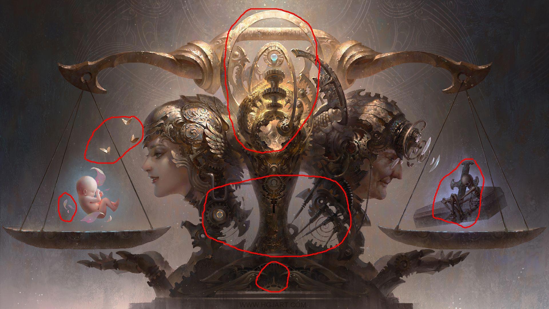 Первое - пришлось определять знаковую систему. Восток и Запад довольно отличаются друг от друга, и даже если автор переходит на другую знаковую систему, кое-что все равно останется привычным. Ну как направление написания - чтения. По общему колориту я решила что художник - китаец. Ну вот тут не спрашивайте точно - как. На ощущение этого работает фон, верхняя часть весов и шлемы Двуликой - как я ее назвала,бабочки и лепестки лотоса около младенца. Ну а раз Китай, то вспоминаем, что в Китае написание и чтение закладываются сверху вниз справа налево.