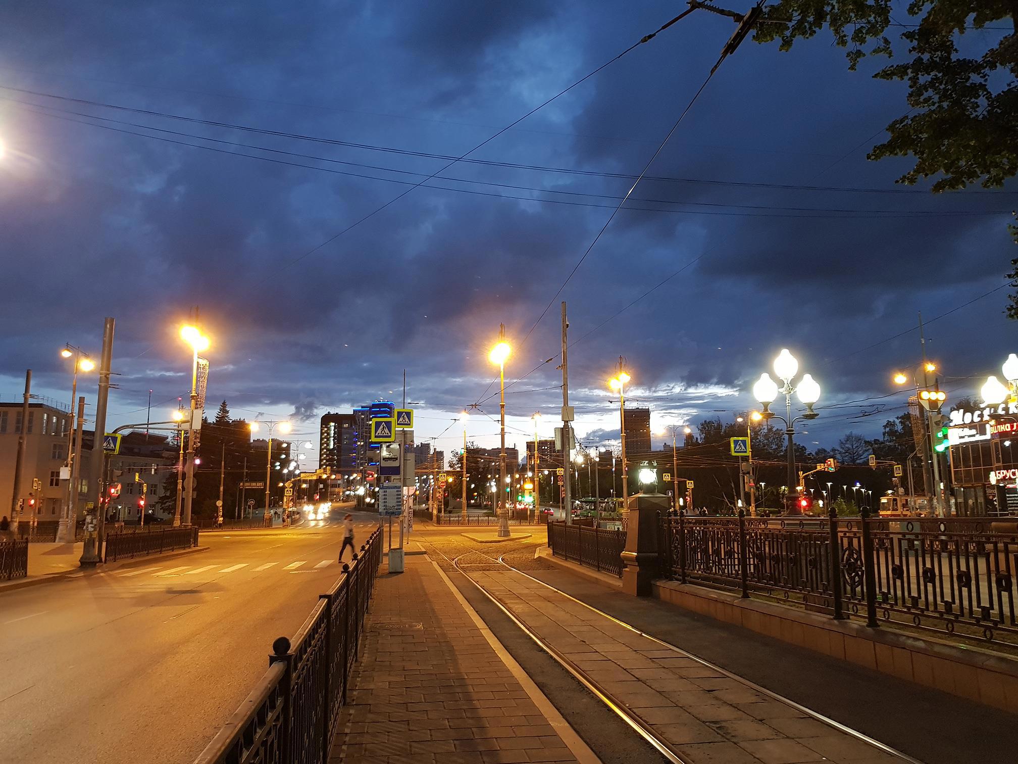 Ещё немного полюбовавшись закатом, я дождался момента, когда Солнце скрылось в набежавших тучах и потопал в сторону дома. Небольшая (большая, на самом деле) проблема нашего города - транспорт. После девяти большинство маршрутов уже начинают разъезжаться по паркам, а у трамваев есть Северное, Западное и Южное депо, Восточного нет (вы же помните, где черепашка на карте, да?) Потому все 13-е уже ехали в своё Северное депо и я прогулялся до центра города (чуть больше 3 км) и дождался последнего трамвая из центра, что едет к нам. 20 минут ожидания были скрашены музыкой в наушниках и красивым видом: