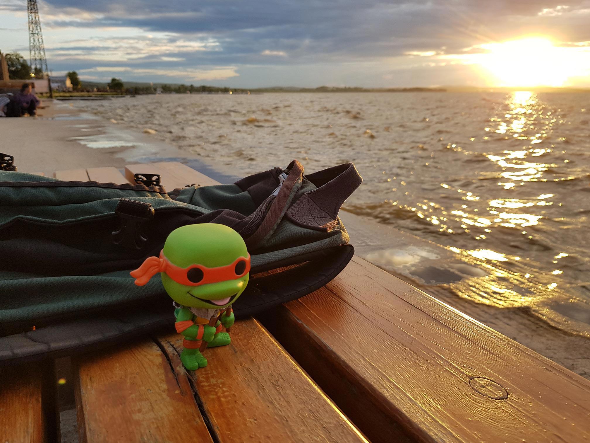 Я, как и всегда, был не один, а с маленьким спутником-талисманом. Всем привет от Майки! В этот момент, с этой скамеечки и таким Солнцем у меня даже возникло ощущение настоящего моря (да, без запаха, да, противоположный берег всё равно виден, но не придирайтесь так строго!).