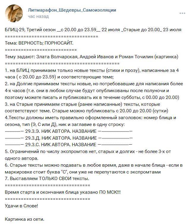 Автор: Акан ТроянскийИтак, снова пятница, и снова Литмарафон Шедевры Самоизоляции https://vk.com/club194461736 проводит очередную Тренировку https://vk.com/wall-194461736_32701