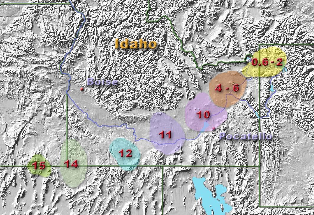На протяжении миллионов лет Северо-Американская континентальная плита сдвигалась относительно плюма, а он раз за разом «прожигал» новые кальдеры, вызывая очередные извержения.