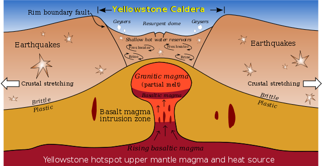 Питание для вулкана Йеллоустон обеспечивает гигантский плюм — вертикальный поток твёрдой мантийной породы, раскалённый до 1600 °C. Ближе к поверхности Земли часть плюма расплавляется в магму, что приводит к образованию гейзеров и грязевых котлов. В разрезе плюм представляет собой 660-километровый столб с боковыми вздутиями, расширяющийся кверху в форме воронки. Два его верхних ответвления находятся непосредственно под территорией национального парка, образуя магматическую камеру (глубина её — 8—16 км ниже поверхности Земли).