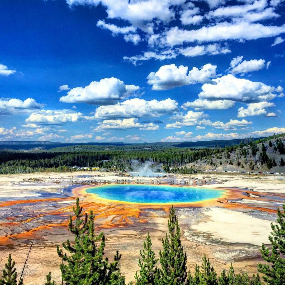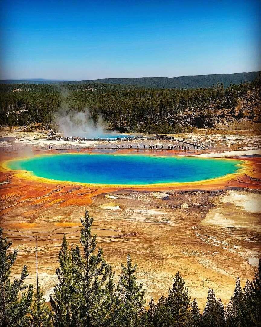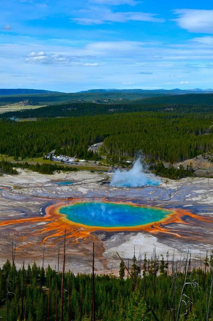 Вид с высоты птичьего полета на большой призматический источник из Йеллоустонского национального парка. Йеллоустонский национальный парк - это зона отдыха в дикой природе площадью почти 3500 кв. миль на вершине вулканической горячей точки.