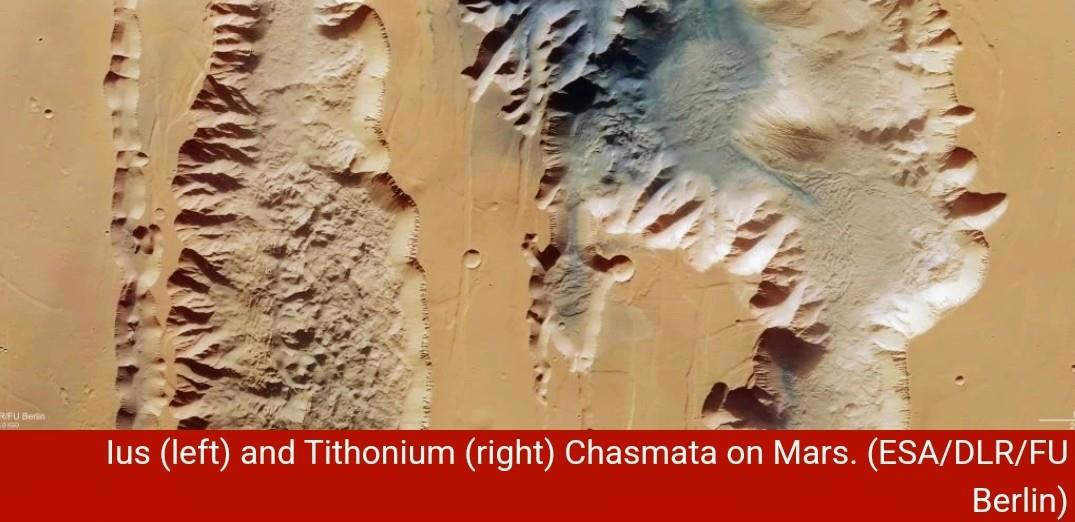 Сегментные изображения, сделанные Mars Express, включают участки двух расщелин, Ius слева и Tithonium справа. Тщательное изучение деталей этих невероятных природных структур может помочь ученым понять геологию и геологическую историю Марса.