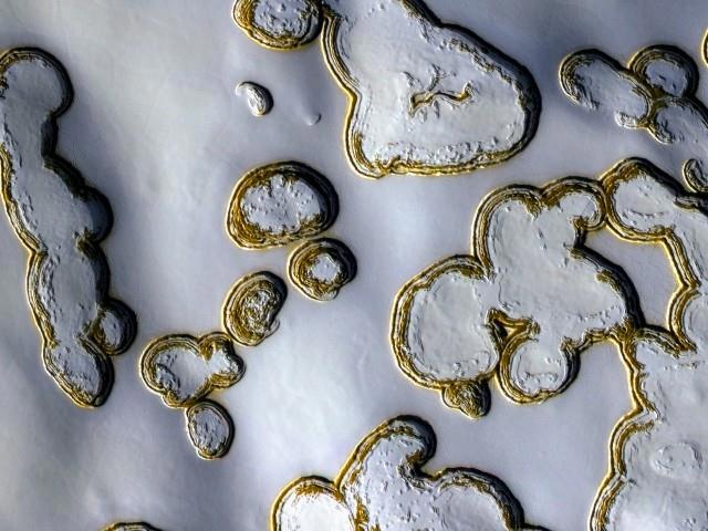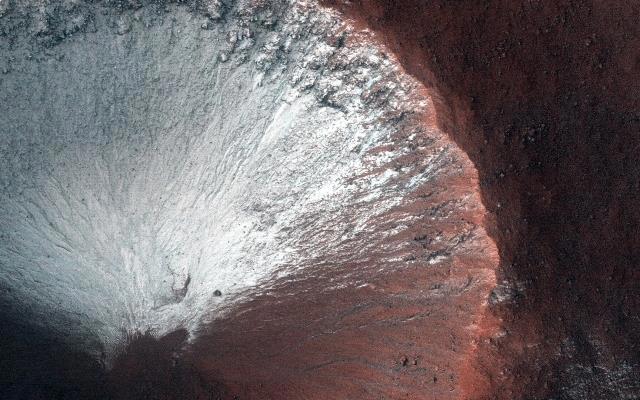 Так меняются времена года на Красной планете. Уже наступила весна, но изморозь всё ещё не покинула одинокую гору