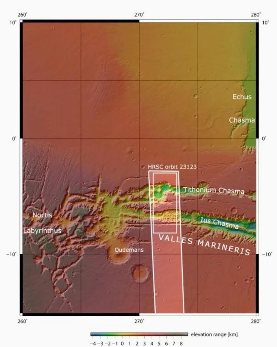 Самый большой известный каньон в Солнечной системе получает звездную обработку на новых снимках с орбитального аппарата Mars Express Европейского космического агентства.
