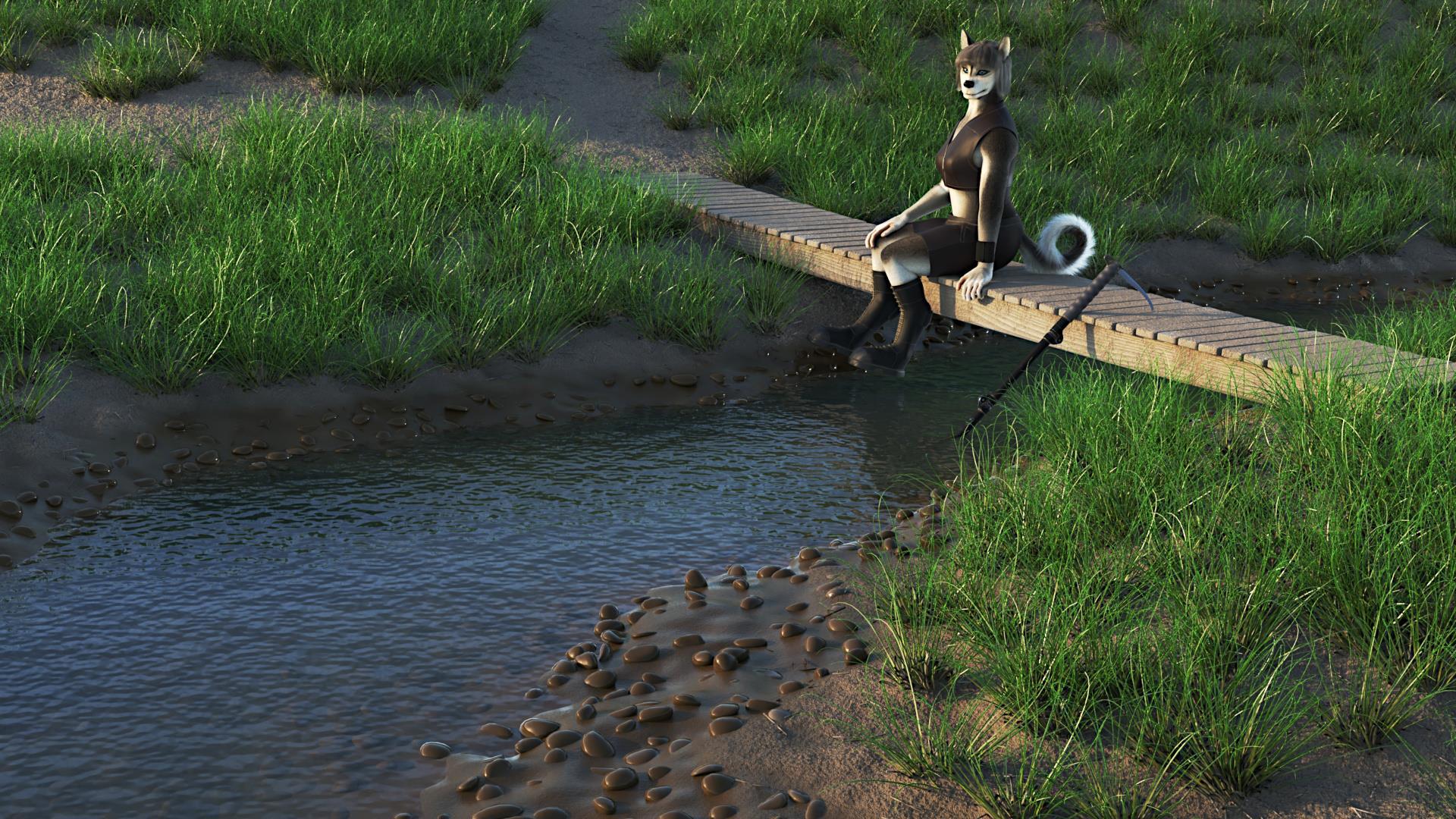 Рисовать ещё и амулеты я поленился (точнее развешивать их), потому вот что-то отдалённо похожее на Аню сидит на чём-то похожем на мостик среди чего-то похожего на что-то: