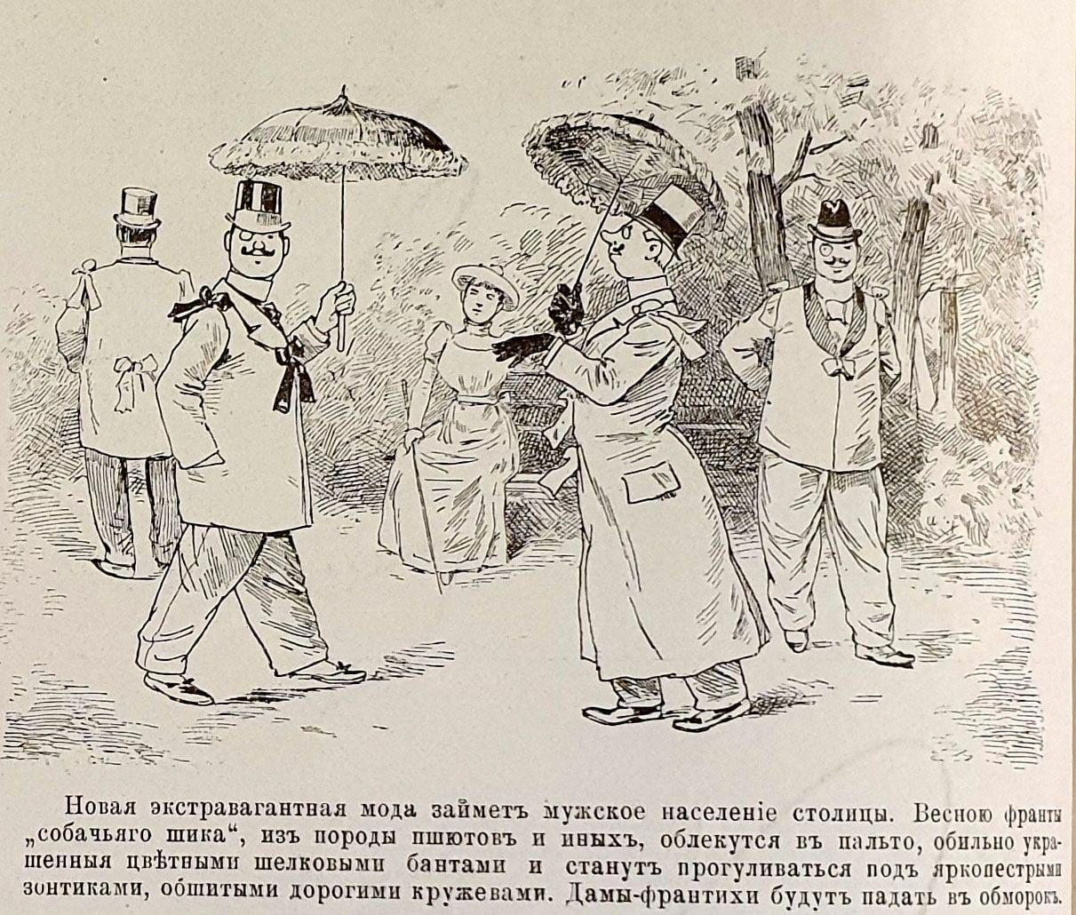 Новая экстравагантная мода займет мужское население столицы. Весною франты „собачьего шика“, из породы пшютов и иных, облекутся в пальто, обильно украшенные цветными шелковыми бантами и станут прогуливаться под яркопестрыми зонтиками, обшитыми дорогими кружевами. Дамы-франтихи будут падать в обморок.