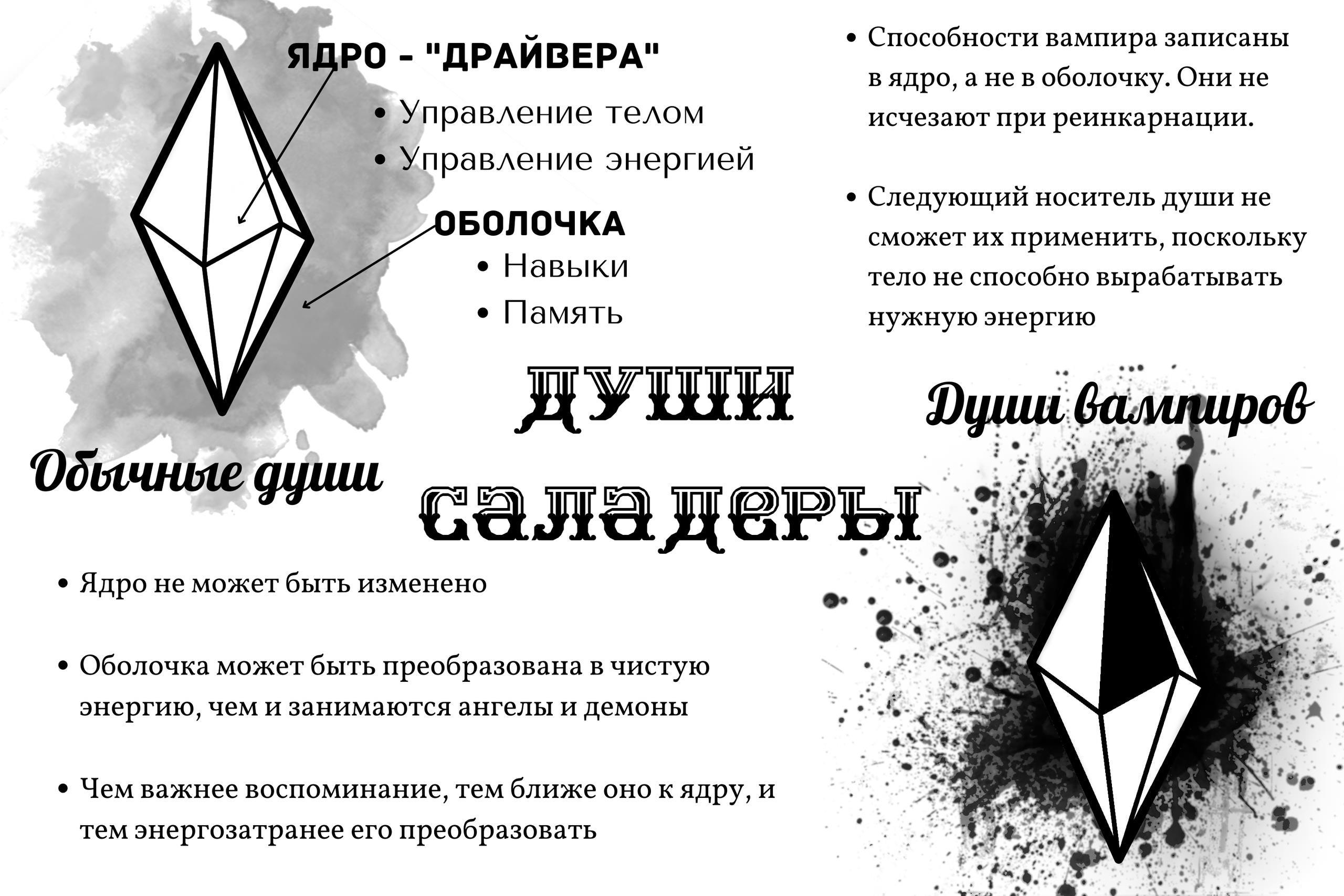 Душа состоит из ядра (core), где прописаны базовые инструкции по управлению телом, и оболочки, которая которая нарастает с течением жизни, храня навыки, воспоминания и умения. Оболочка может быть с минимальными энергозатратами преобразована в энергию, нужную ангелам и демонам, поэтому они и собирают души после смерти. Чем насыщеннее была жизнь, тем больше энергии можно получить, поэтому местные демоны не любят принесенных в жертву младенцев — энергии в таких душах почти нет.