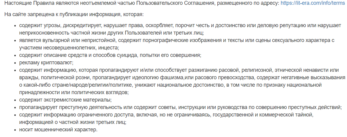 Реклама криптовалют. Вот тут я прям теряюсь. Что плохого сделали Литнету криптовалюты? То есть если пишешь киберпанк, в котором персонажи расплачиваются криптой, такое нельзя. Пусть рублями платят. На худой конец натуральным обменом пользуются. Но, вообще, чем такой запрет может быть мотивирован? Где логика-то? Хотя, о чём я? Какая уж логика у Литнета...