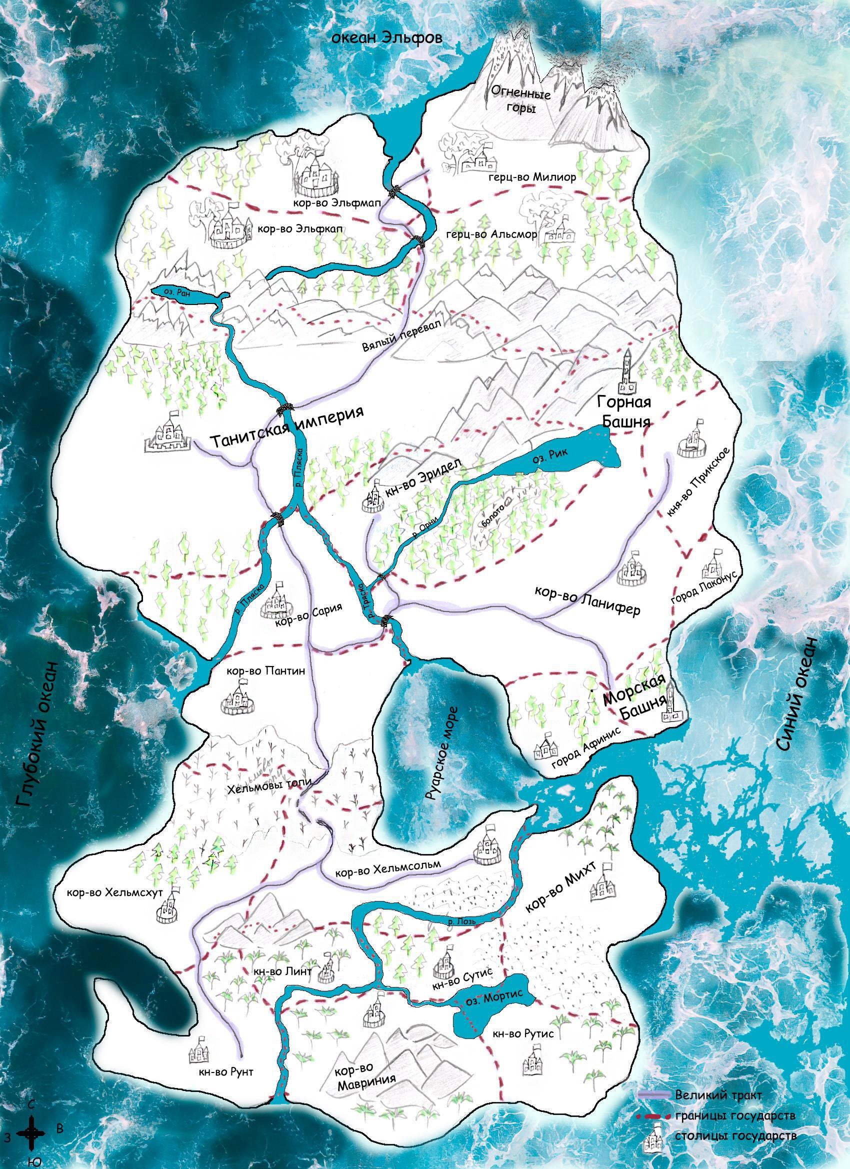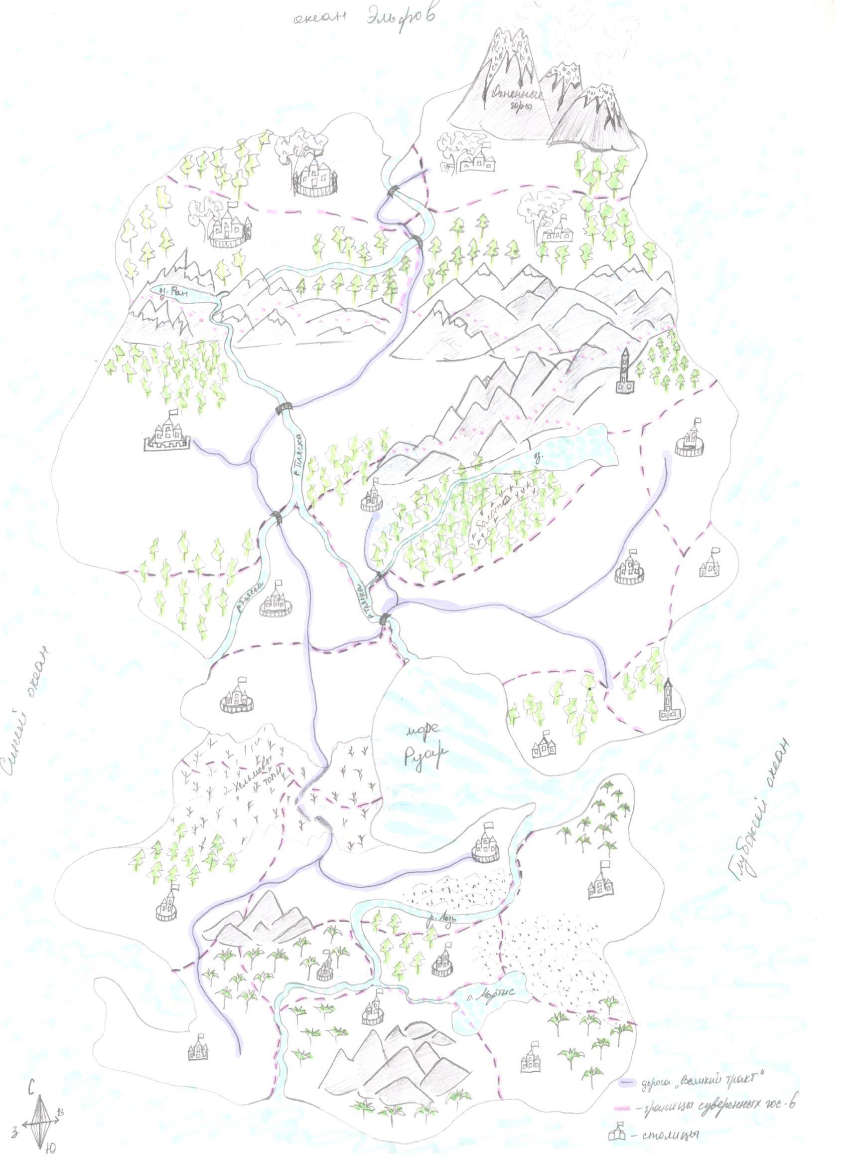Начал писать я свою боярку-попаданку, стал более менее расписывать сначала мир, продумывать государства, географию, основные для сюжета места... Ну и в общем, сам не заметил, как взял карандаш, листок, и начал что-то чертить. Потом перечертил на чистовую, немного добавил цветов, ну вот и получилась примитивненькая карта: