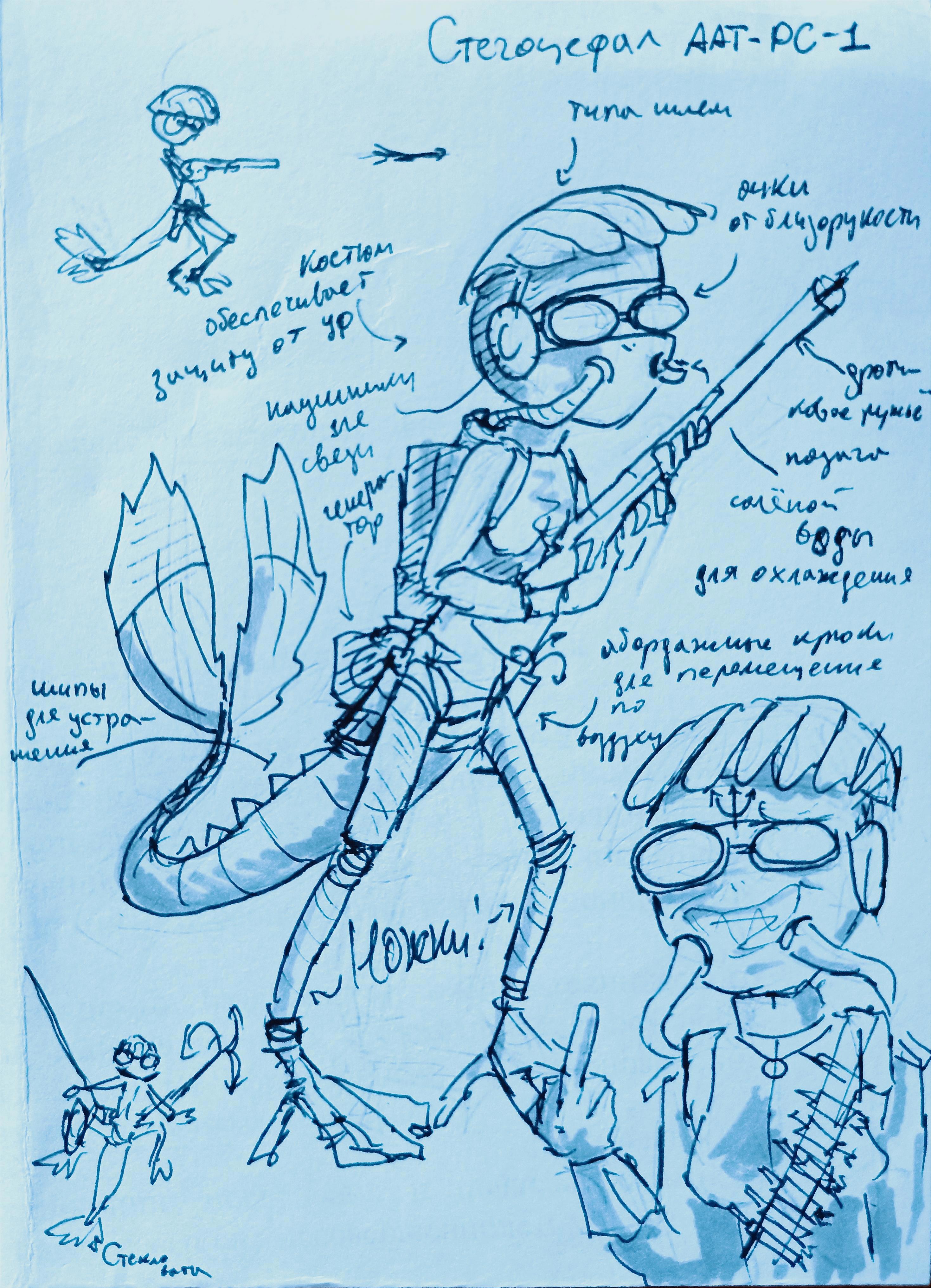 Это "Стегоцефал" — костюм для военных действий атлатетис на суше. Сочетает в себе наиболее выдающиеся достижения русалочьей техники и при этом прикрывает два основных русалочьих недостатка: отсутствие нижних конечностей и высокая фоточувствительность.