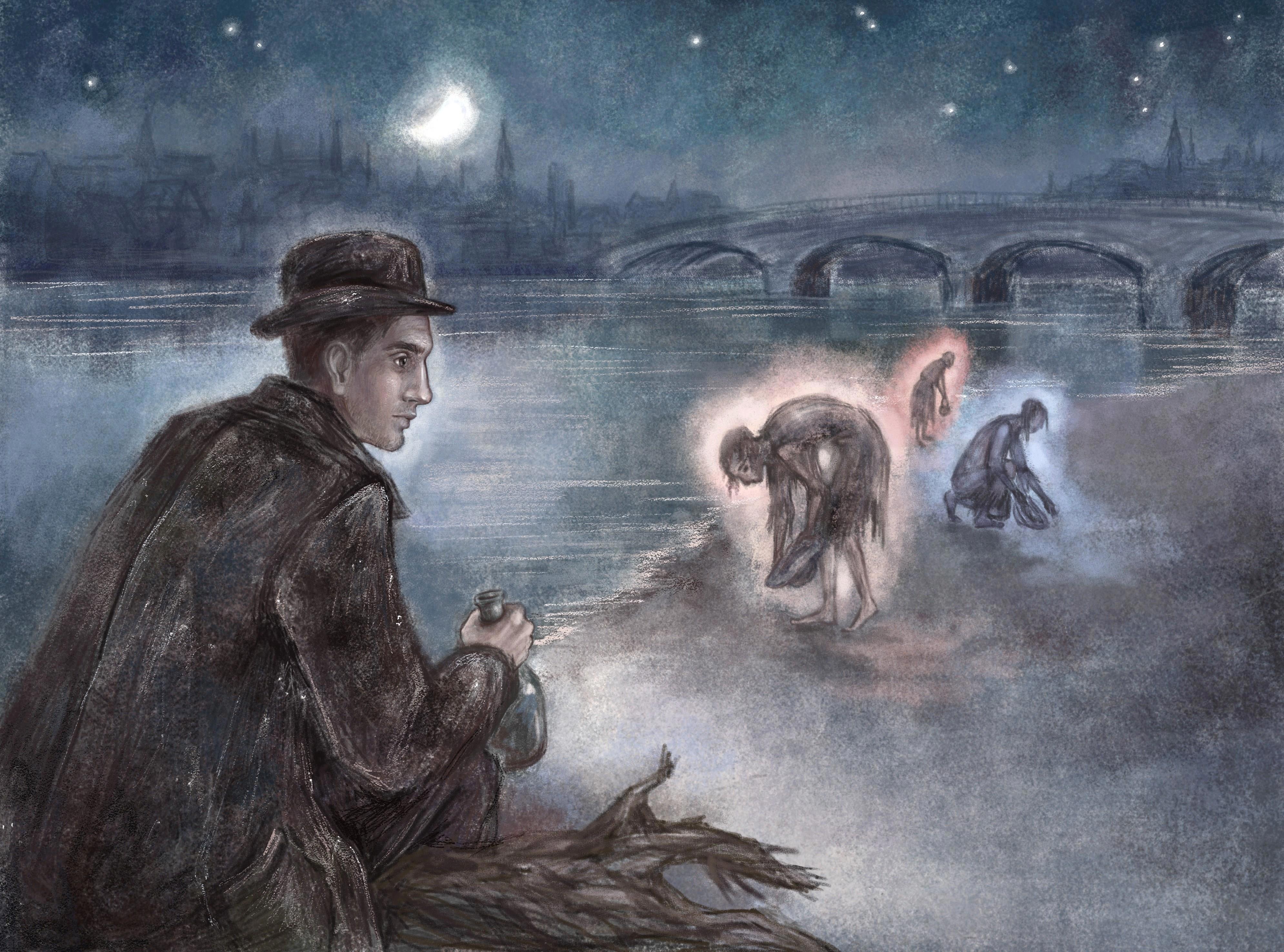 На рисунке Елены Джон Репейник впервые видит, как, в сущности, прекрасен любой, самый опустившийся и безнадёжный человек. И, пожалуй, именно это переживание сможет позже предостеречь его от очень нехорошего решения, которое обернулось бы большой кровью. Техника совершенно удивительная, вы только посмотрите на эти краски, на то, как небо отражается в реке, на звёзды и месяц в импрессионистских ореолах. Лицо героя хранит спокойное, простое и вместе с тем почти восторженное выражение. Что ж, Джон, самое трудное впереди, береги силы, автор приготовил на финал весьма поганый сюрприз. Ну да тебе не привыкать.