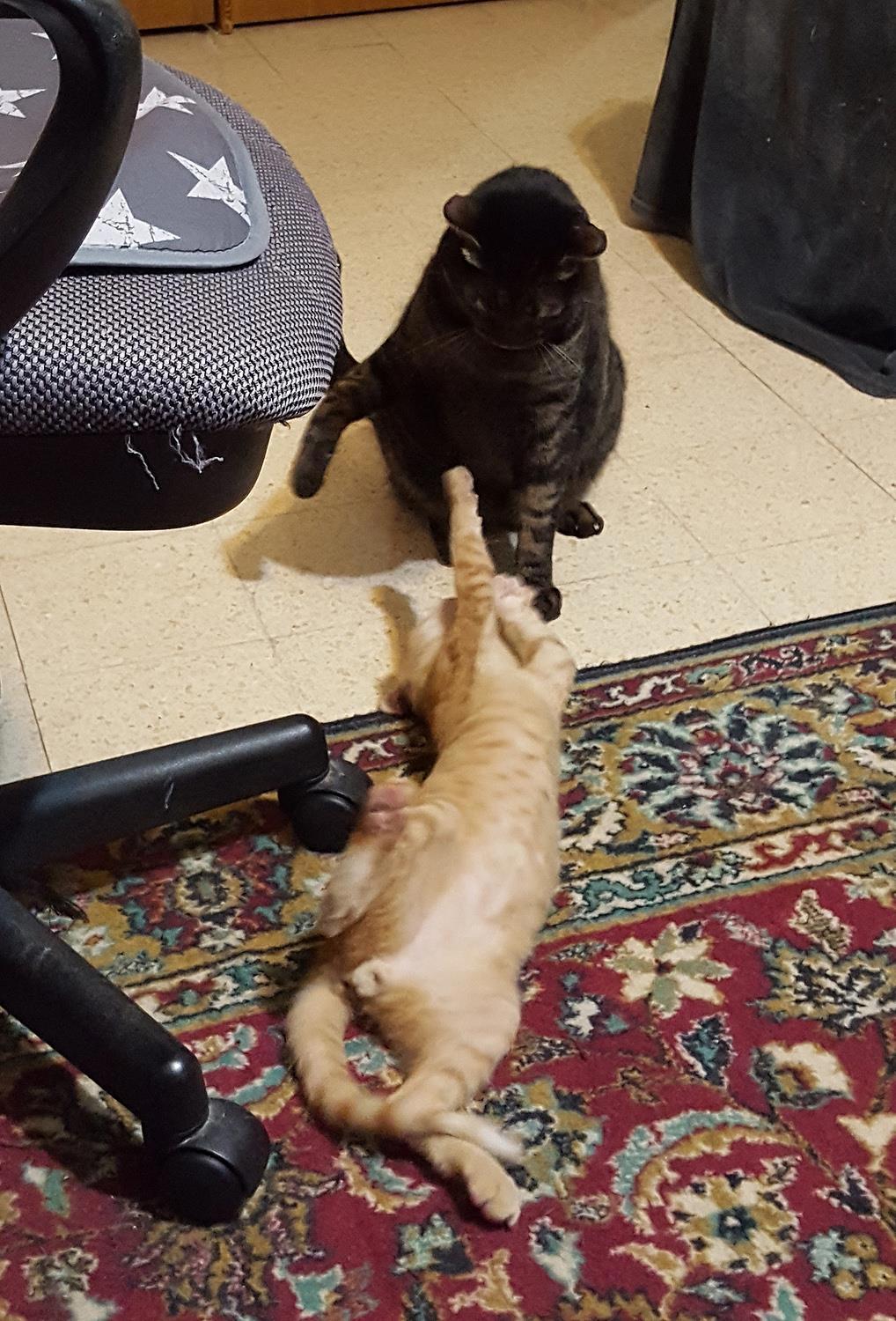 А может, и кажется... кто их, котов, знает. Но обнадеживает то, что оба больше демонстрируют драку, чем дерутся. Без членовредительства, ттт. Хотя... пока мелкий-то мелкий, а когда вырастет и будет восприниматься как соперник? Они-то оба будут "обрезаны", но, по моим наблюдениям, не так уж сильно это влияет на темперамент.