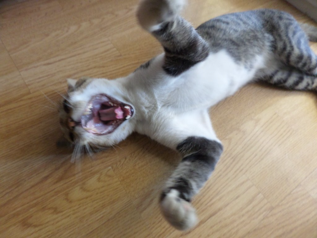 Полежал в тенечке, потом поскандалил с Митькой, задрался с Тишкой, затем зашел в дом, развалился на пороге, под струями кондиционера и начал у всех проверять докУменты.