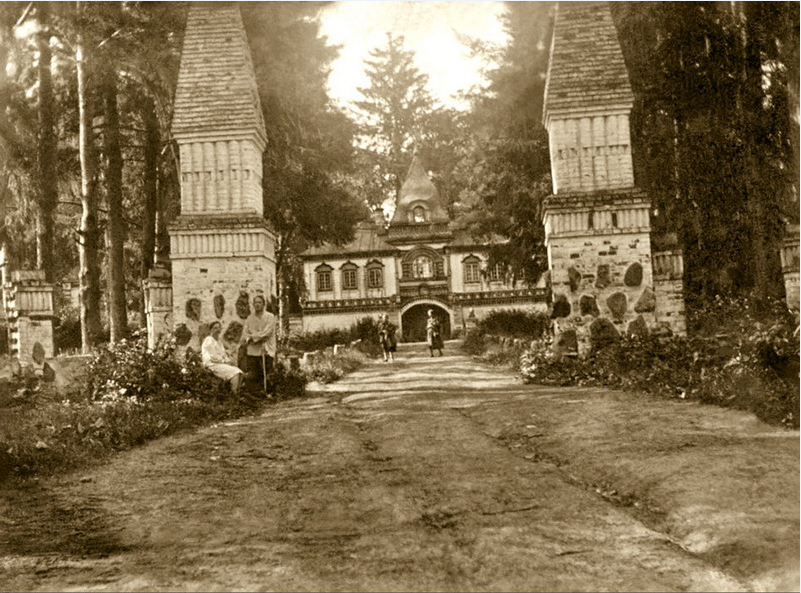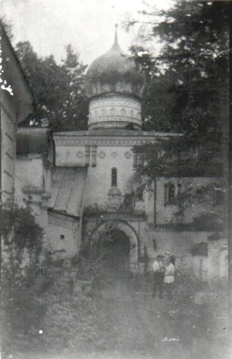 Ворота на въезде в усадьбу с южной стороны. Видны надвратные "боярские палаты". Фотография 1938 года.