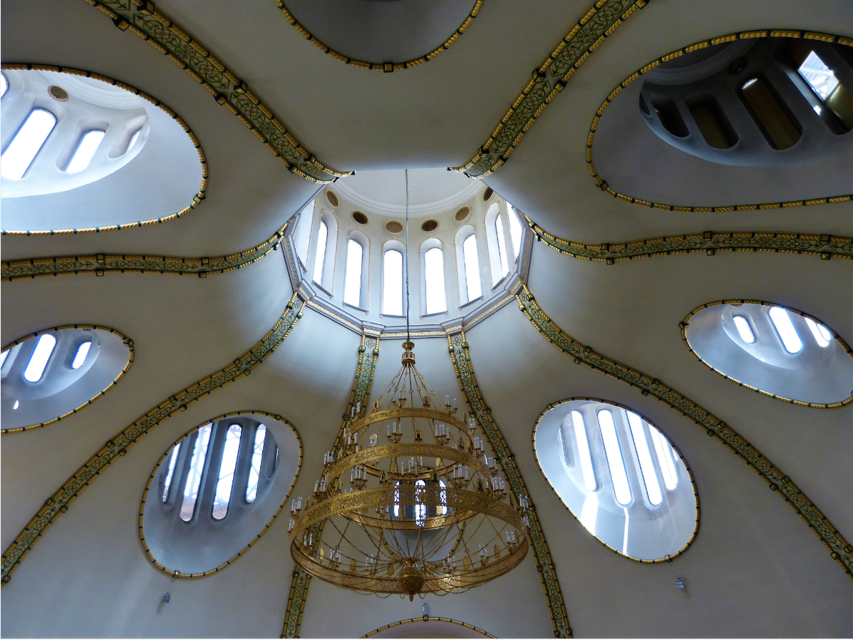 Внутри этот храм не менее интересен. Единственный неф представляет собой многоугольник с чётким ритмом дуг на стенах по периметру.