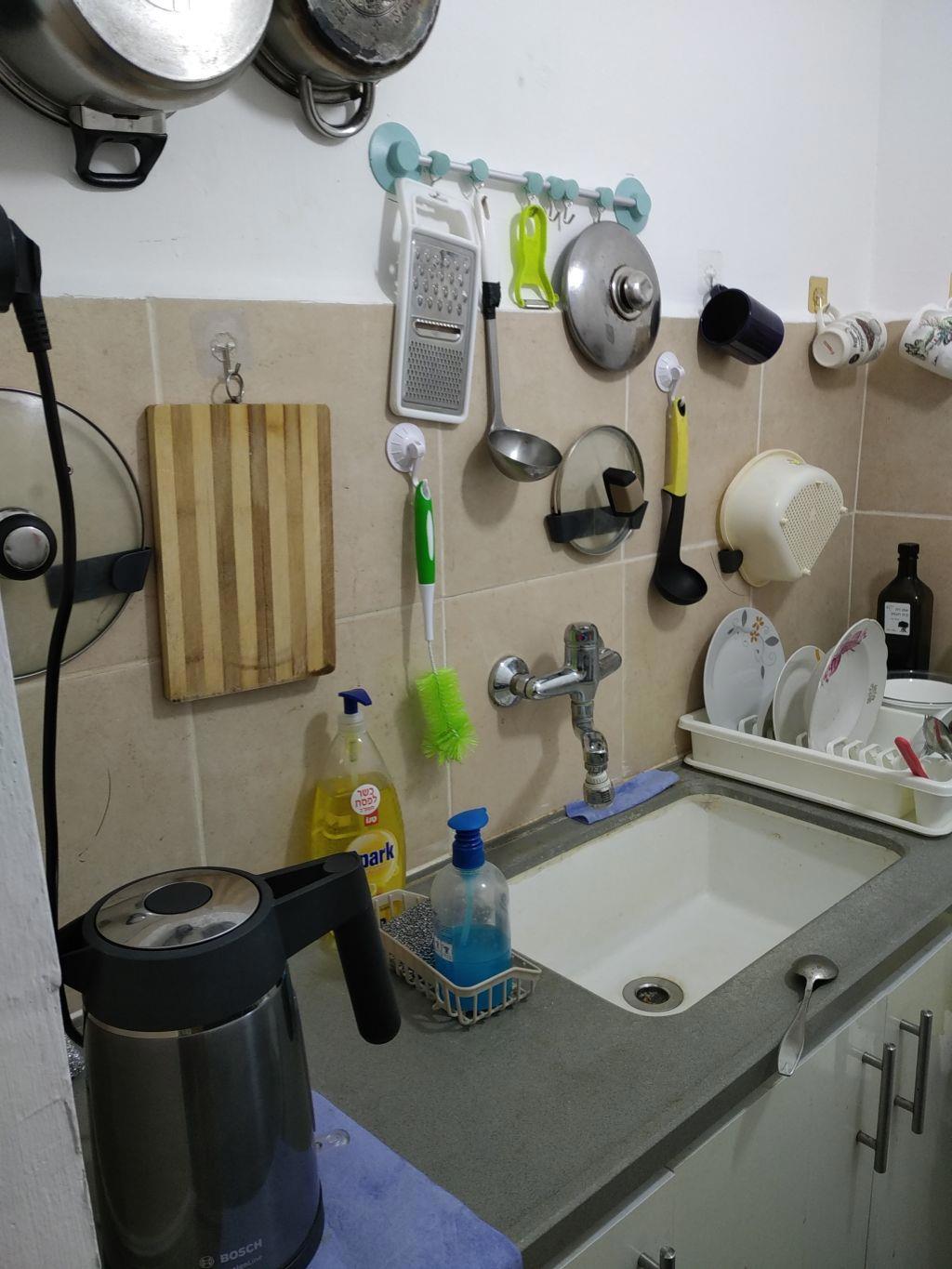 Обстановка кухни обошлась бы мне в 1600 шекелей (с установкой шкафов), но я загрузил стену китайскими прищепками для посуды и ограничился 43 шекелями.