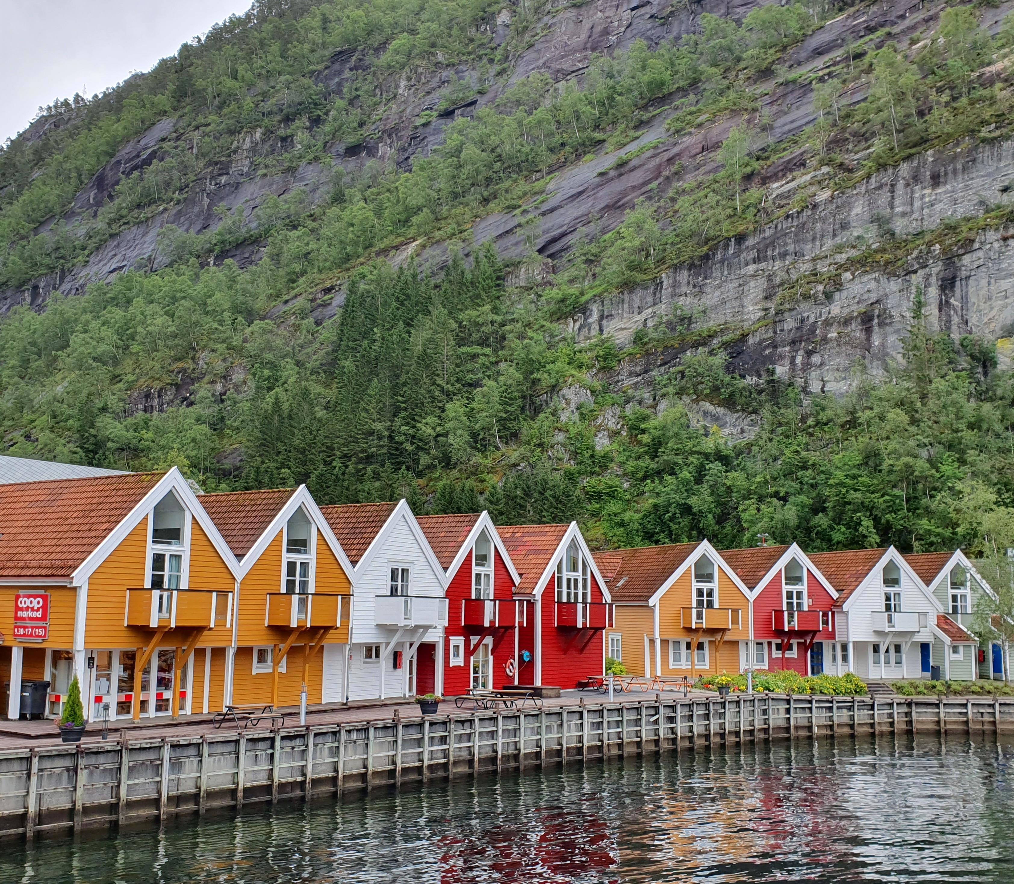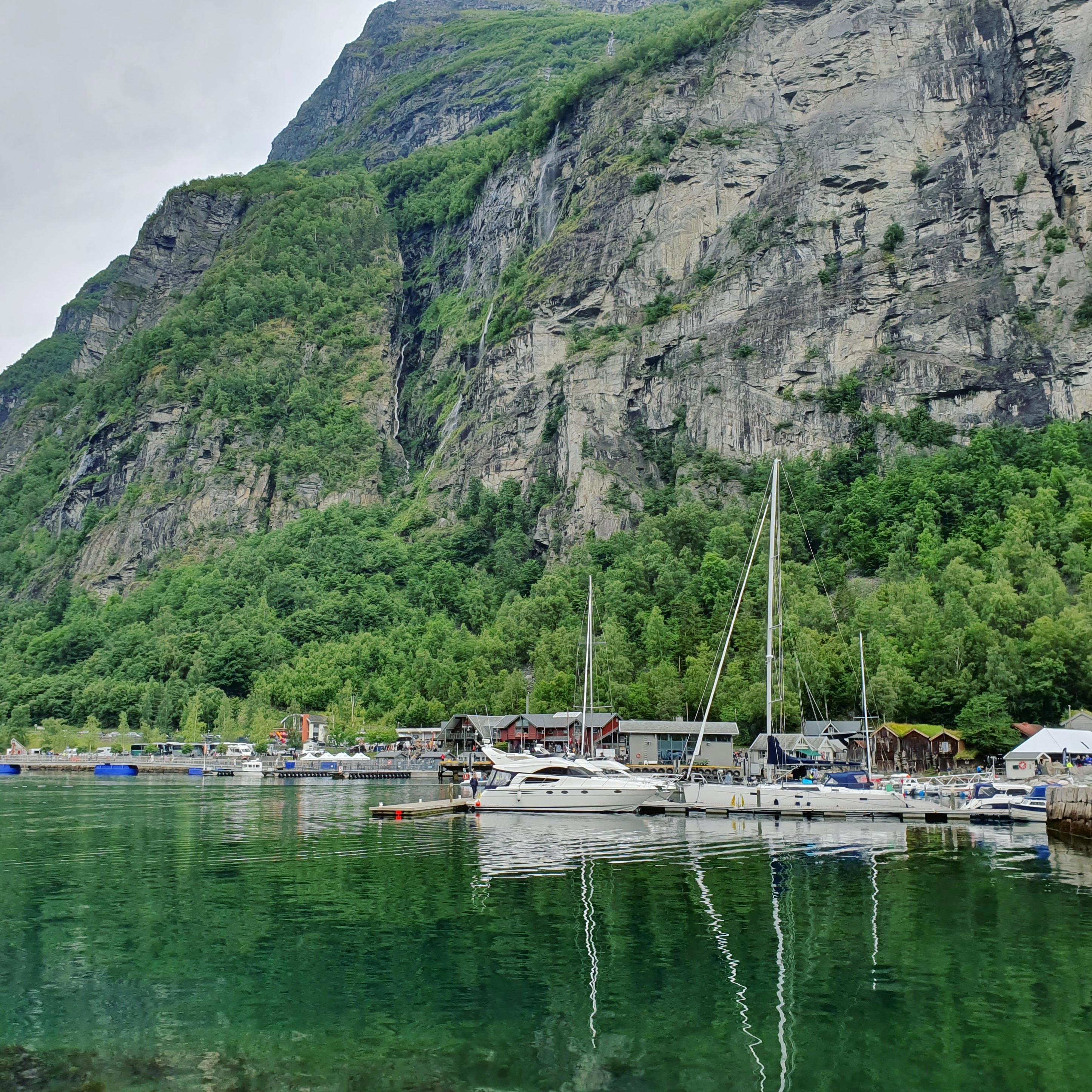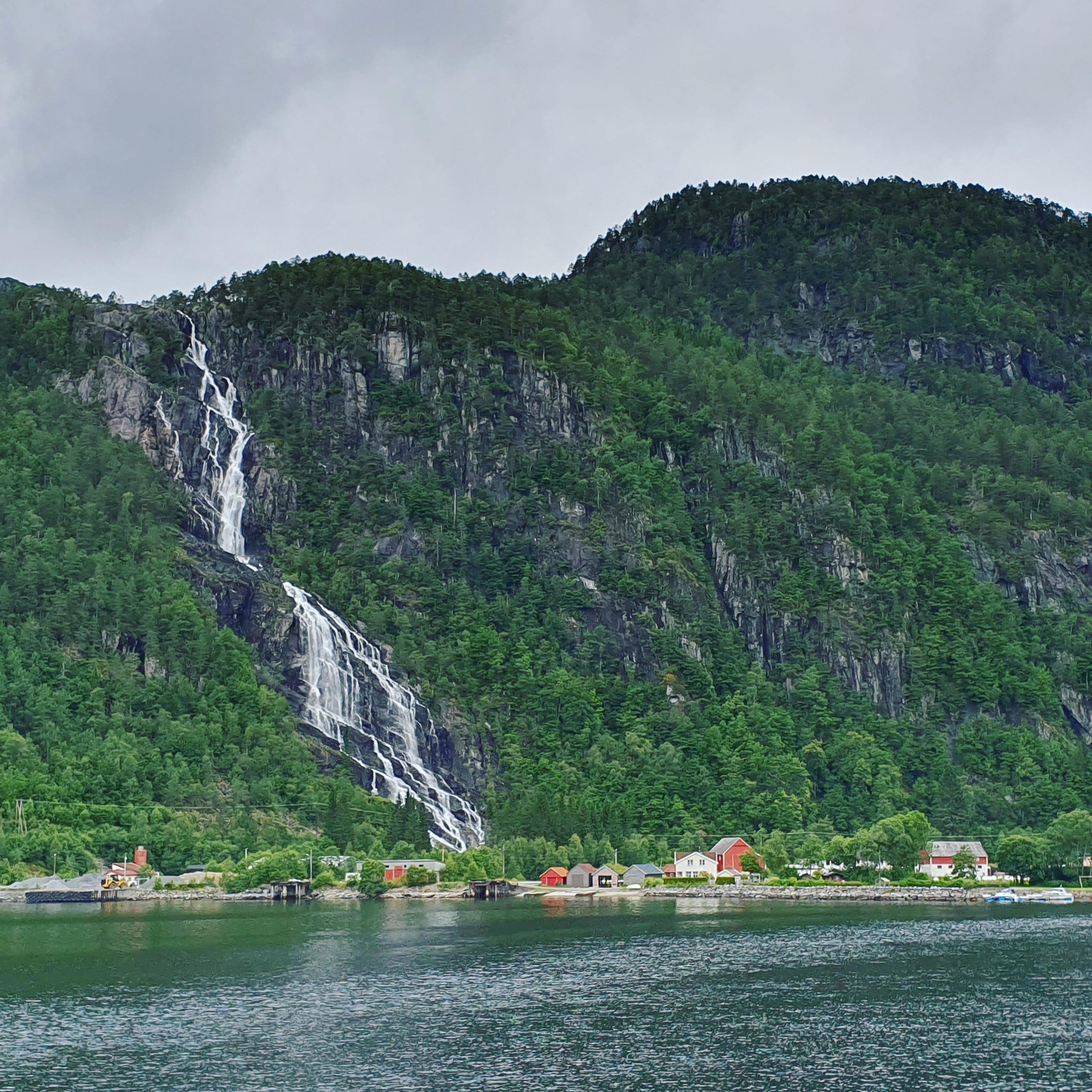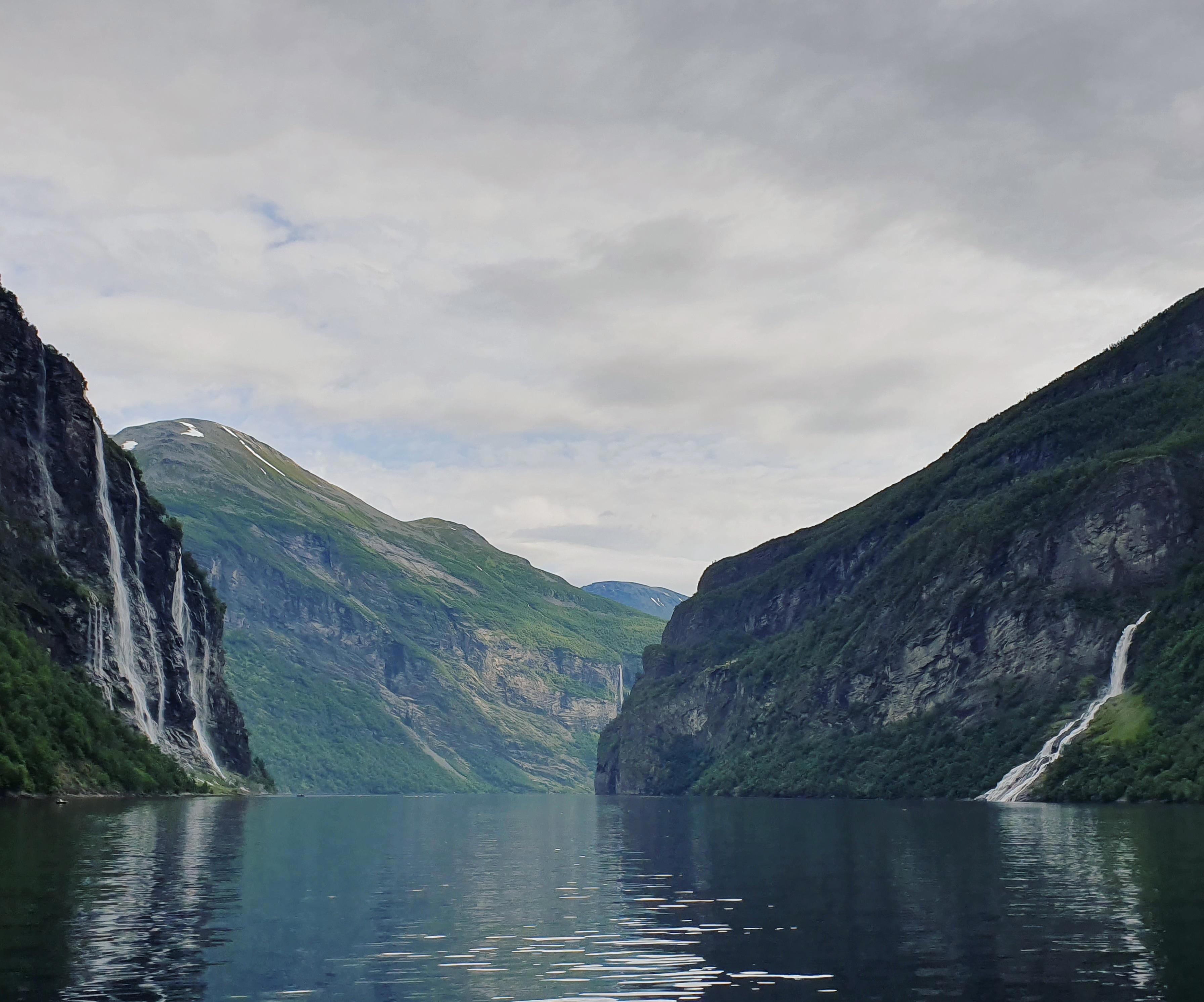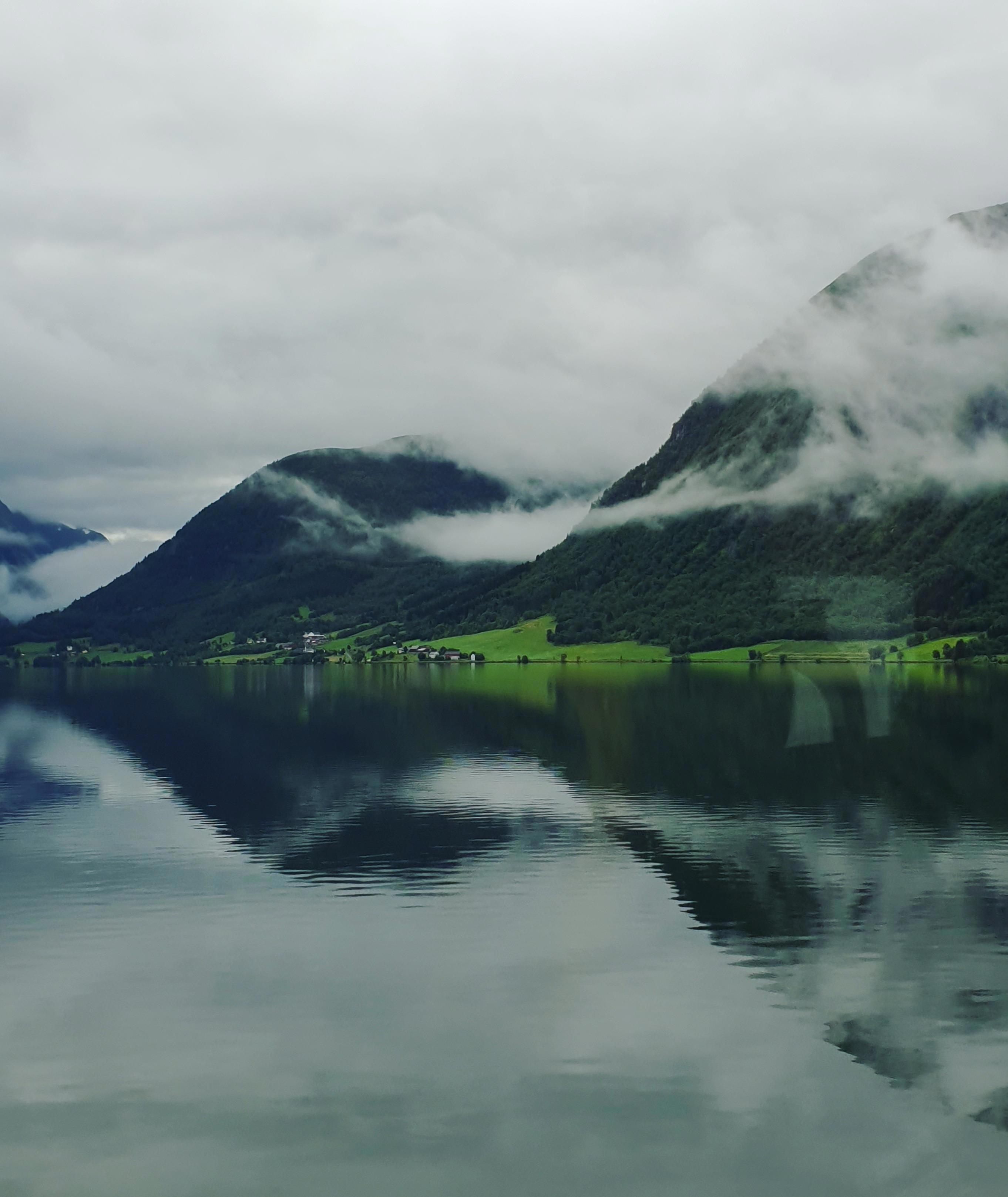 Отвесные скалы, покрытые темными мхами, густые леса отражаются в неподвижной, зеркально-гладкой воде, вдалеке синеют горы, кое-где на вершине белеет снег — все это фьорды.
