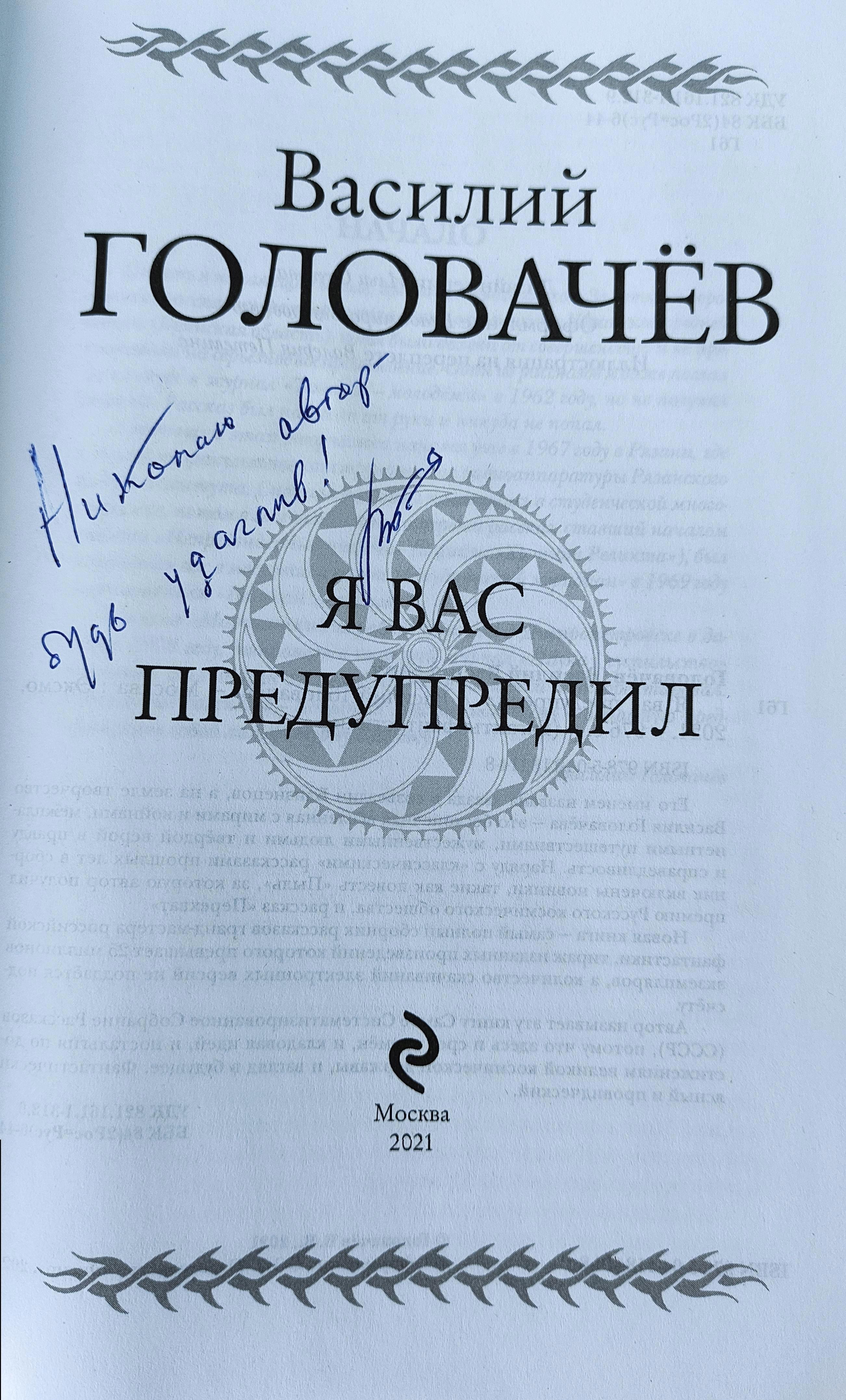 В какой-то момент Головачев, рассказывая о творческих планах, упомянул омнибус «Я вас предупредил», Самое Систематизированное Собрание Рассказов (СССР), вышедший в прошлом году. И угадайте, кто привез эту книгу, чтобы с ее помощью похитить подпись автора? Хе-хе. Я высунул ее из рюкзака и по просьбе Головачева воздел над головой, чтобы все видели. После этого котел подо мной пылал уже не так сильно.