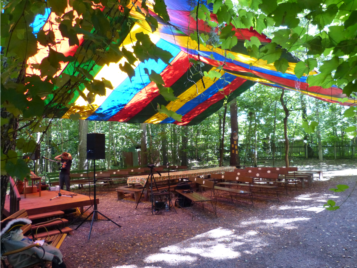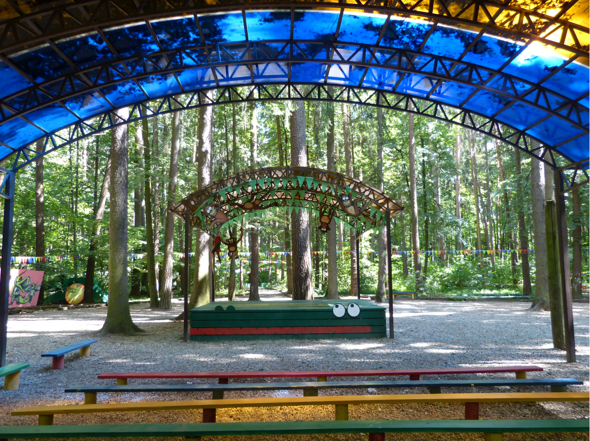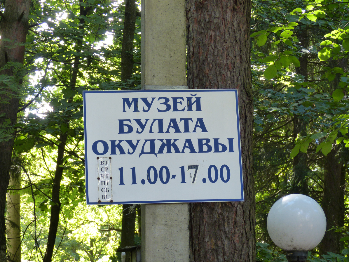 Дача Булата Шалвовича была гораздо скромнее, чем писательские дома тридцатых годов. На бывшем участке Окуджавы тоже есть летний театр: скамейки под тканевой крышей.