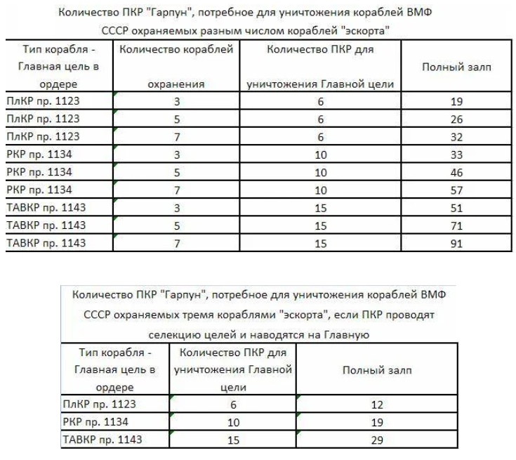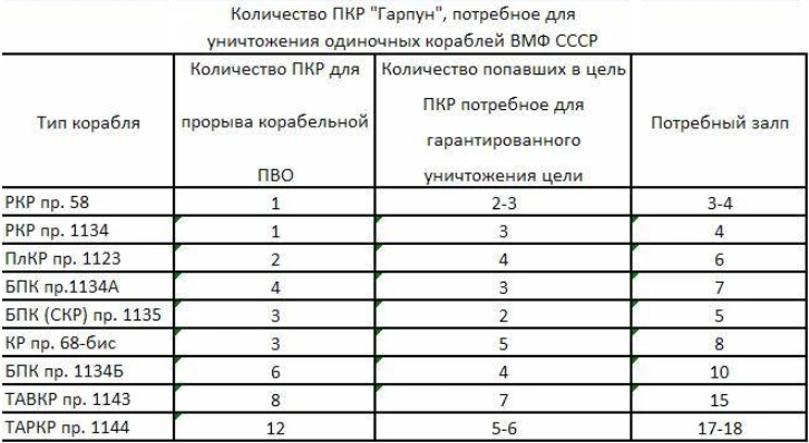 В таблице оценки ВМС США количества ракет «Гарпун» с обычной БЧ потребной для утопления советских кораблей. Из-за того что у корабля есть ПВО даже в случае спец БЧ на поражение проекта 1144 придется потратить не одну ракету, а 13 — 12 пойдут на насыщение ПВО корабля. Даже если предположить что половина ракет приходится на АК-630 и против ядерной ракеты они не эффективны поскольку прямое попадание не требуется 7 ядерных ракет на корабль тоже многовато будет. Именно ядерных потому что если отправить вперед обычные и следом ядерную будет довольно очевидно где ядерная. и ее перехватят даже ценой прорыва части обычных ракет. Если же ракеты идут единой стаей то прорыв именно ядерной будет лотереей. Учитывая что на один Б-52 американцы вешали 12 гарпунов пара стратокрепостей легко насыщала ПВО одиночного корабля и с запасом наносила повреждения не совместимые с плавучестью обычными ракетыми. В случае же ордера все зависит от того удастся ли выявить главную цель