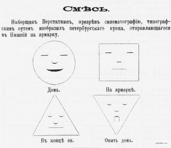 Далее типографскими символами и знаками препинания вниманию читателя были представлены четыре смайлика, обозначающие четыре эмоциональных состояния петербургского купца: «Дома», «На ярмарке», «В конце её» и «Опять дома». По нынешним времена столь смелый графический эксперимент тут же разошелся бы на мемы, однако в позапрошлом веке по достоинству оценен, увы, не был.