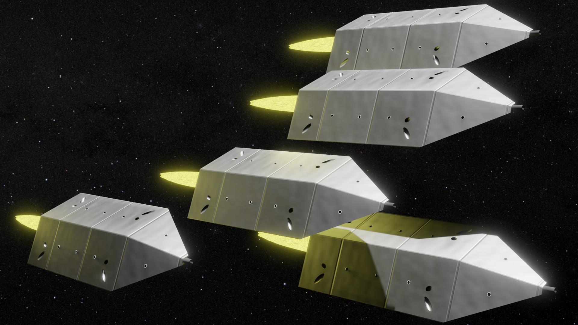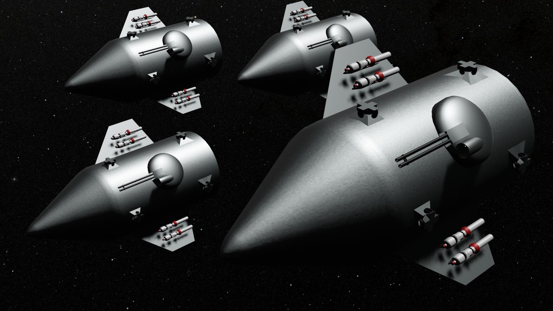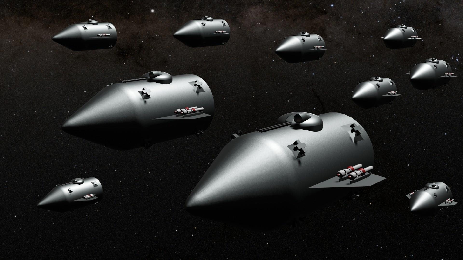 Дронами в космических флотах принято называть беспилотники вооруженные какой-либо пушкой. Если же дрон обвешан ракетами он будет считаться ракетой. Такая классификация пошла из земных ВКС которым за время Десятилетней пришлось перейти от простых одноступенчатых ракет в начале к просто двухступенчатым, а затем и к ракетам с многоразовой первой ступенью несущей системы целеуказания для терминальных ступеней. Дроны при этом развивались как выносные автономные орудийные платформы и заметно отличались от первых ступеней ракет по дельте.
