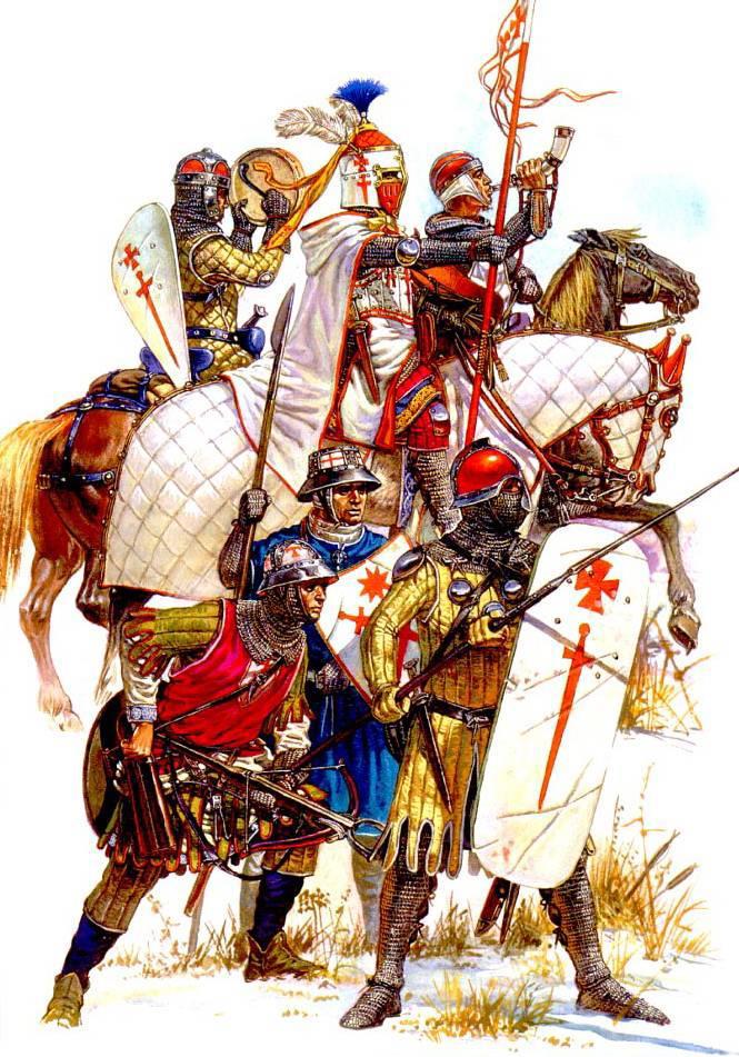Общий вид меченосцев. По центру на коне рыцарь в белом, оставшиеся всадники - оруженосцы. Два пехотинца в "железных шляпах" - сержанты. И собственно, с немецкого название этого шлема так и переводилось, в оригинале "айзенхут".