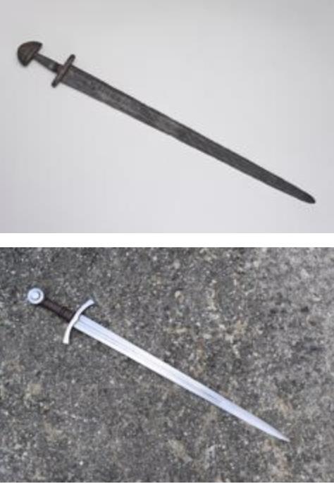 Мечи. Сверху "каролинг" с более широким и овальным наконечником, не шибко предназначенном для колющих ударов. Хотя кто мешает пробовать? Кроме того, насколько я понимаю, уколоть им реально, а вот броню он не пробьёт. Поэтому с развитием и более широким распространением защитного вооружения, "каролинг" эволюционировал в "капетинг" (ниже) - романский или рыцарский меч с более узким острием для нанесения проникающих колющих ударов. Кстати, на Руси, согласно Кирпичникову, "каролинги" были в ходу до 14 века.