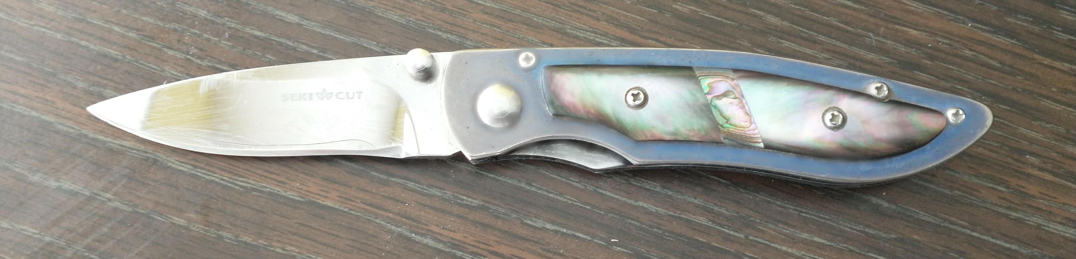 Этот маленький ножик с перламутровой накладкой из центра японского ножеделания Seki Cut тоже ламинат, и тоже д2, если присмотреться можно увидеть эти слои на лезвии. Получил его в подарок на ДР от жены и сына.