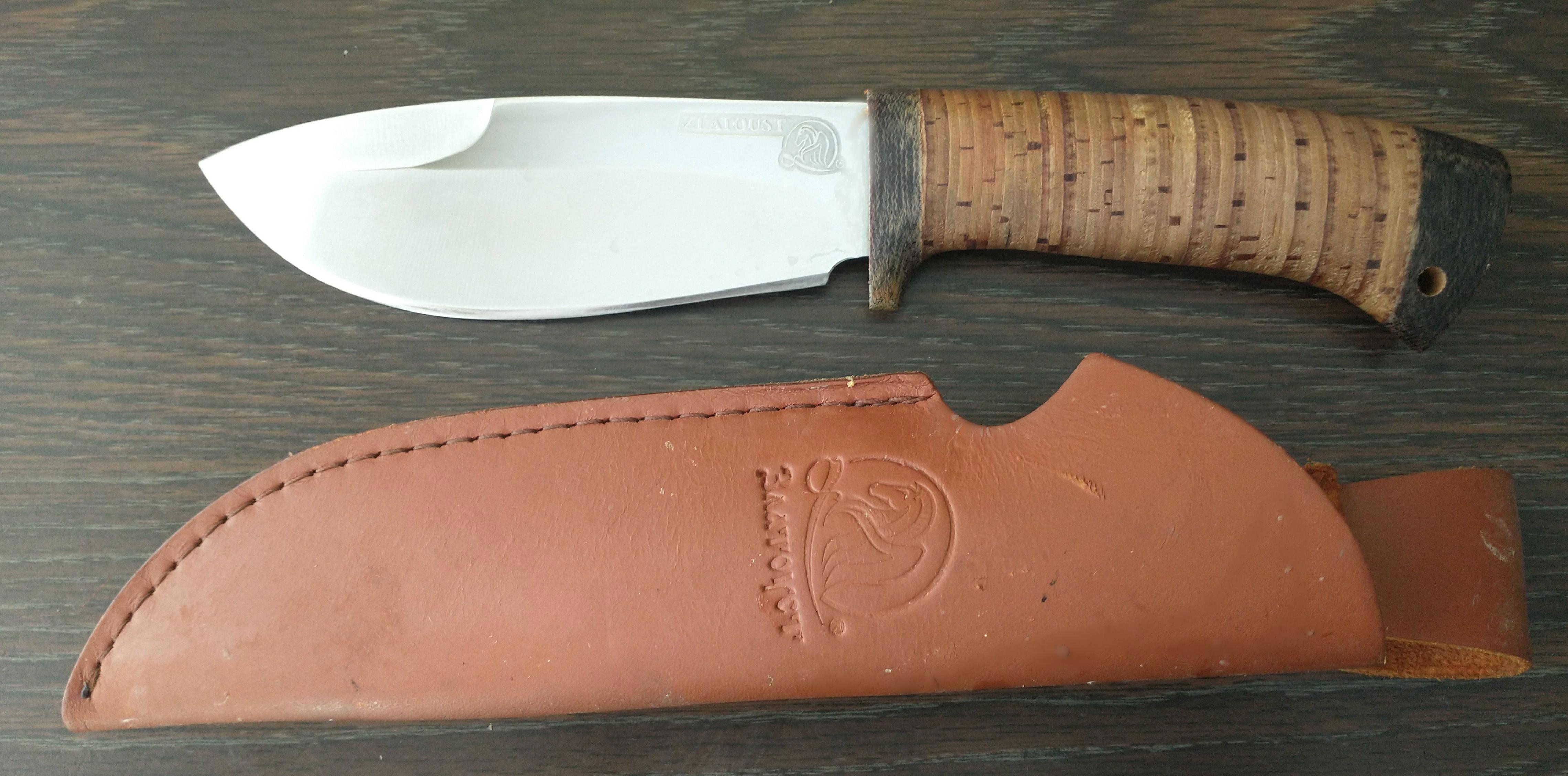 А вот и златоустовский Эдельвейс с ручкой из бересты и лезвие подшипниковой стали 95Х18, он почему-то на снимке выглядит меньше, чем в жизни -Длина клинка - 13,5 см