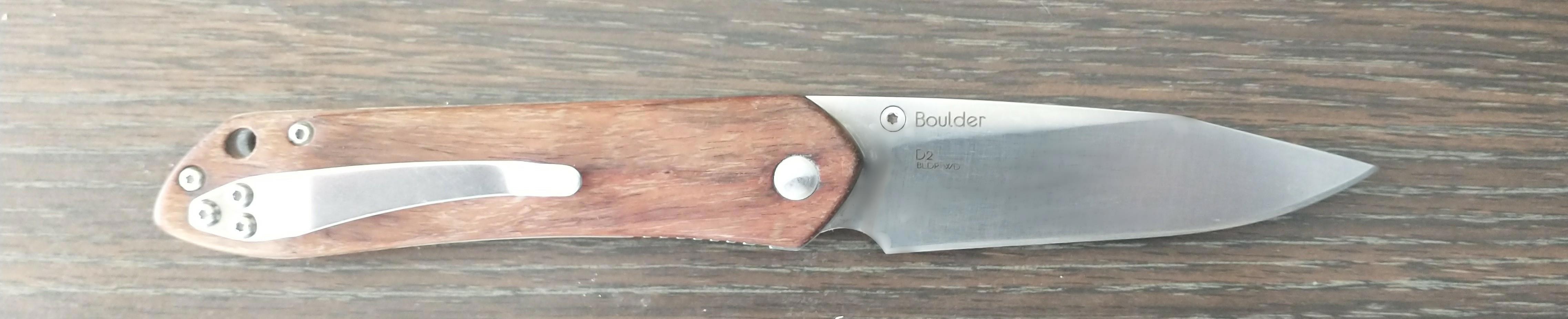 Это карманный нож компании Black Tusk по имени Boulder - валун, лезвие из стали d2 и помощь при открывании. Объясняю: выкидные ножи сбоку ли, из середины незаконны в стране, но этот нож обошёл ограничения: при лёгком нажиме на шпенёк - лезвие распахивается. Клип - зажим, и видимость ножа из кармана делает его легальным.