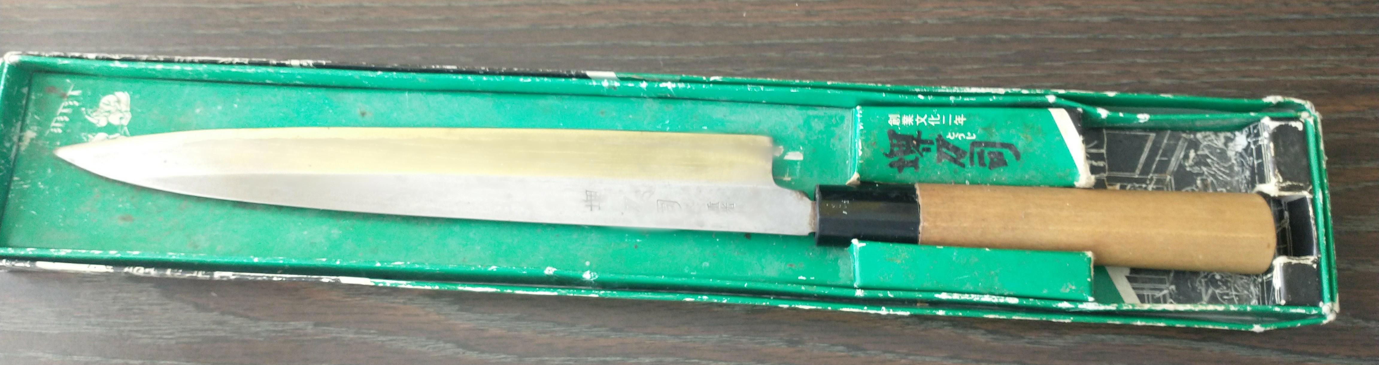 О! Это один из самых желанных ножей, янагиба, тоже ламинат, многослойное лезвие из углеродистой стали, был откован в Японии на глазах сына, который и привёз его мне.