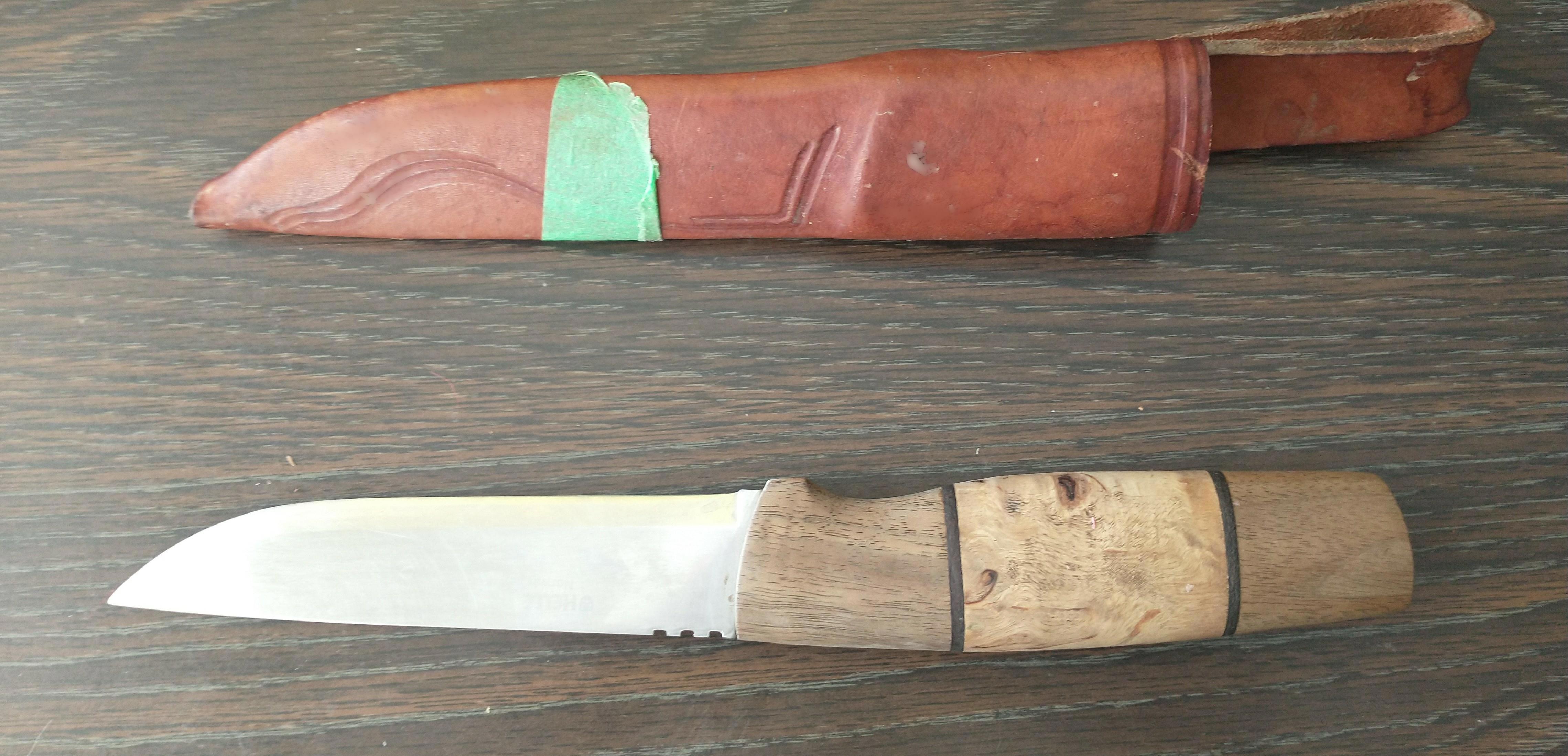 Нож Хелле Бракар Норвегия с ручкой из карликовой берёзы и орехового дерева, этот нож ламинат, т.е. лезвие состоит из трёх слоёв: посередине очень твёрдый но ломкий, а с боков его защищают мягкие слои. Зелёная бумажка на ножнах - для жены, чтобы брала его для чего хошь и не хватала другие.